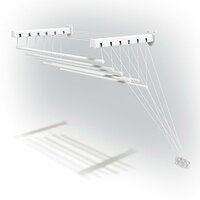 Данная потолочная сушилка для белья представляет собой 6 планок, длинной 1,6 метра каждая и суммарной рабочей длинной 9,6 метров. Каждую планку можно опустить и поднять с помощью специального воревочно-роликового механизма и закрепить на удобной высоте.