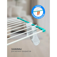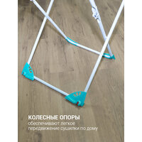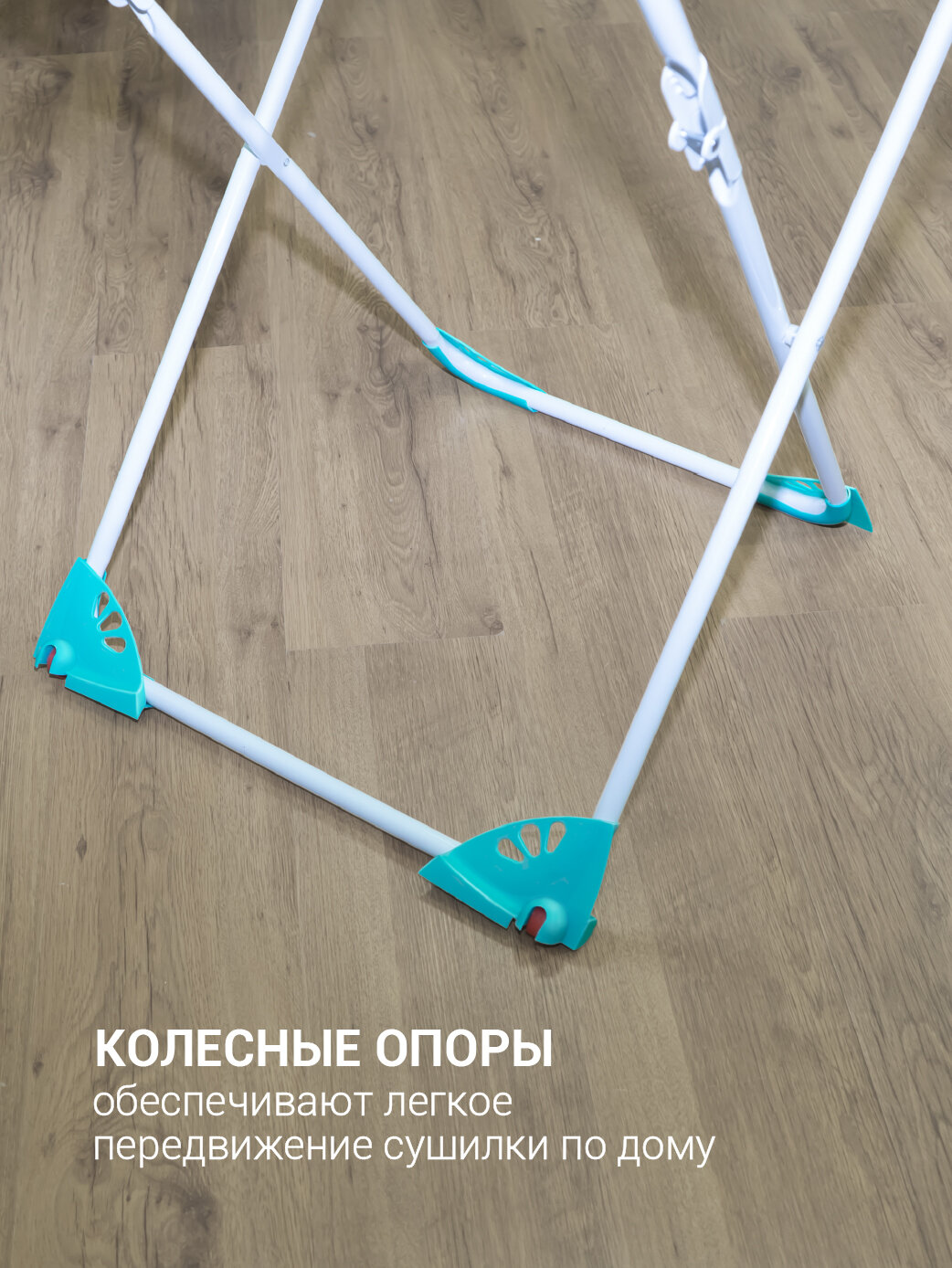Напольная сушилка для белья AURA Deluxe это практичное решение для сушки белья дома. Конструктивная особенность сушилки позволяет установить подходящую длину прутьев с помощью телескопического сдвижения. Колесные опоры обеспечивают легкое передвижение сушилки по дому. Диаметр металлических прутьев позволяет сушить белье без заломов. Качественное порошковое окрашивание металлических элементов конструкции защищает от образования ржавчины. Полезная длина для навески белья 20 метров.