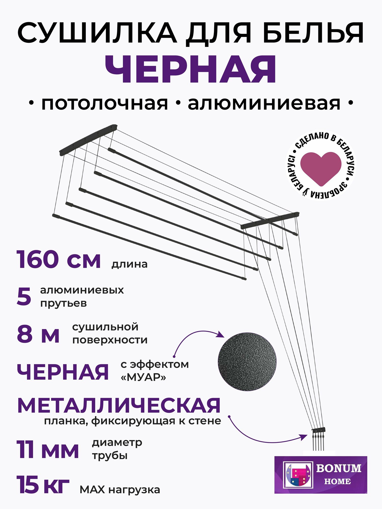 Сушилка для белья потолочная, навесная, алюминиевая в черном цвете с креплением на потолок с 5-ю или 7-ю цельными прутьями. Длинна прутьев 100см,110см,120см,130см,140см,150см,160см,170см. Цвет черный — нескользящая поверхность благодаря мелко структурированной текстуре позволяет удобно развешивать белье. Необычная фактура придает поверхности бархатистость. Элегантный цвет не бликует, не теряет насыщенности. Максимальная нагрузка на один стержень до 3-х кг мокрого белья. Сушилка для белья потолочная изготовлена из алюминиевых прутьев диаметр 11 мм. Прутья не прогибаются, не трескаются и не ржавеют. Прутья сушилки потолочной выполнены из металла высокого качества – первичного алюминия с полимерным покрытием. Материал антикоррозийный, не боится повышенной влажности, а, значит, не оставит следов ржавчины на одежде. Усиленный алюминиевый прут — труба диаметром трубы 11 мм и толщиной стенки 1,2 мм даже после большой перегрузки бельем прутья возвращается в исходное положение. После длительного использования сушилки она остается ровной, не теряет эстетики. Еще одно достоинство материала – легкость (алюминий в два с половиной раза легче стали) – не менее важная составляющая. Чем меньше нагрузка на нить и фурнитуру, тем дольше служит механизм, тем самым увеличивая срок эксплуатации изделия. Стальной крепеж к стене. Крепления к потолку сделаны из высококачественного прочного пластика, что гарантирует долгий срок службы. Пластиковое крепление держит без всяких проблем, имеет более легкую конструкцию, лучше выглядит эстетически и более доступны по бюджету. Сушилка крепится к потолку с помощью дюбелей и саморезов, которые идут в комплекте. При помощи фиксирующих колпачков, которые входят в комплект, прутья опускаются и поднимаются на удобную высоту. Достаточное расстояние между штангами обеспечивает необходимую циркуляцию воздуха. Потолочная сушилка для белья удобна в использовании, легко устанавливается. На упаковке есть QR-код, по которому можно посмотреть принцип установки сушилки. Максимальная нагрузка на сушилку 15 кг. Сушилка в черном цвете смотрится стильно и необычно. Сушилка для одежды изготовлена из прочных, экологически чистых материалов. Произведено в Беларуси.
