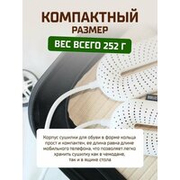 Длина Sothing Zero составляет 170 см. За счет продуманной конструкции этого достаточно, чтобы как следует просушить обувь как маленьких, так и больших размеров. Обувь с низким верхом отлично подойдет для Sothing Zero, кроме самой маленькой детской, для детской обуви у Sothing есть сушилка очень похожей конструкции, но меньше по размеру. Высокую обувь можно сушить, если влага сосредоточена в районе подошвы. Помимо обуви, при помощи Sothing Zero можно сушить носки.