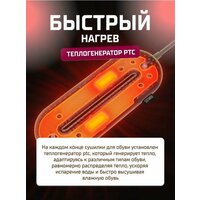 Cушилка для обуви Sothing Zero обладает четырьмя PTC генераторами, от которых исходит тепло, расположены же они на разных концах сушилки. У Sothing Zero тепло распространяется внутри обуви равномерно по всему ее объему таким образом, что эффективно просушивает не только центральную часть, но и пятку и, что особенно важно, носок обуви, до которого обычные сушилки обычно не достают. В результате обувь оказывается высушена более тщательно. Причина же хорошо видна на тепловизоре.