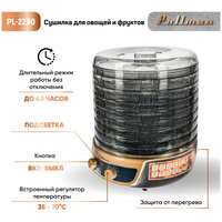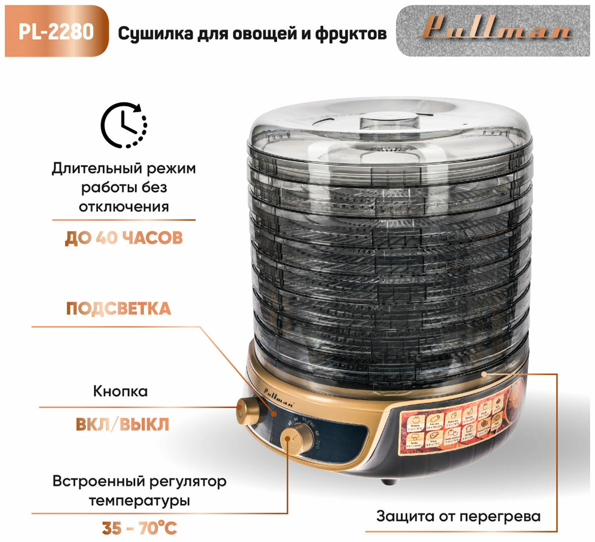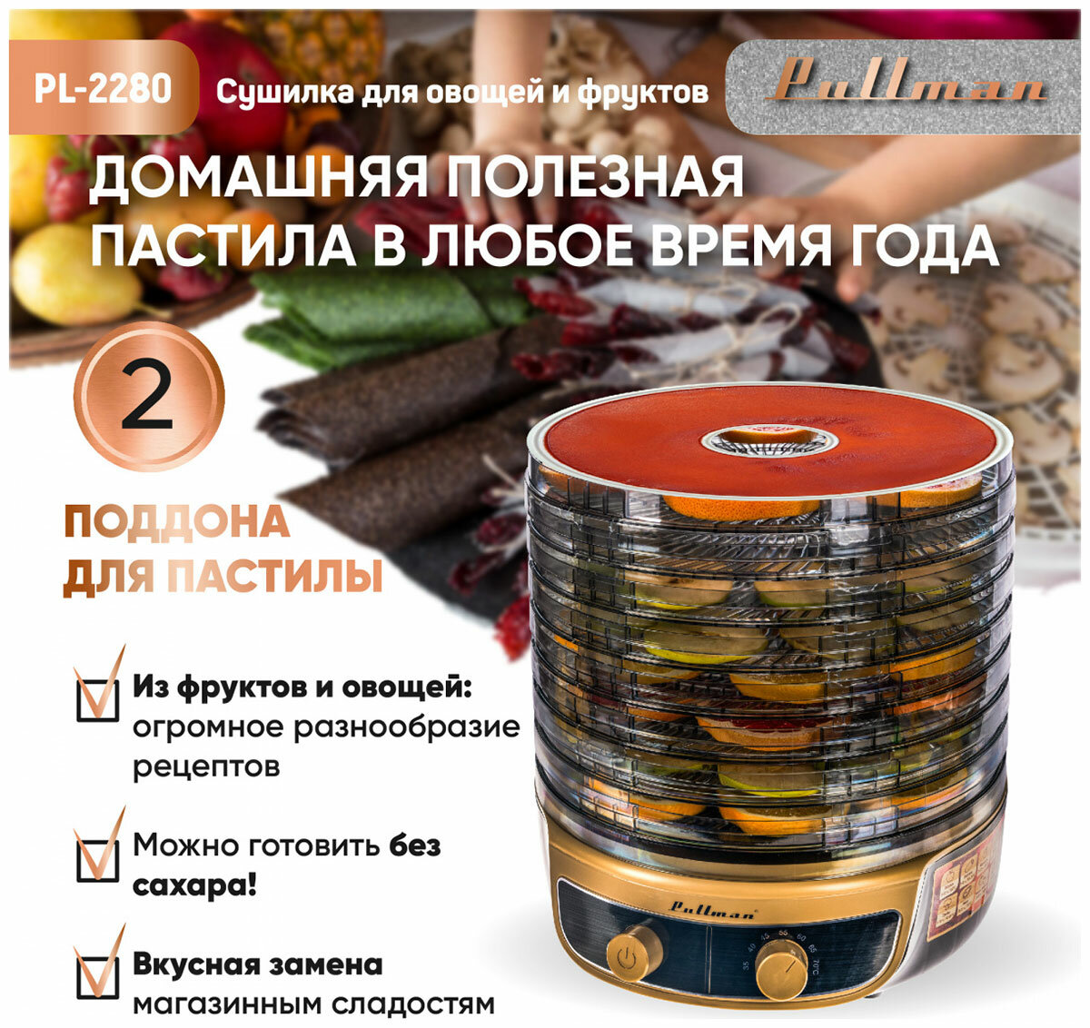 Сушилка для овощей 3в1 с функциями приготовления йогурта и десертов Pullman PL-2280 черно-золот. 8 тонир. поддонов + 2 поддона для пастилы в подарок: сравнение цен, характеристики, фото, актуальное наличие и цены.