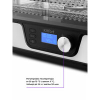 Электрическая сушилка для овощей и фруктов КТ-1918 предназначена для сушки овощей, фруктов, ягод, грибов, корнеплодов, трав и зелени, а также хлеба. Сушилка имеет в комплекте 5 поддонов из прозрачного пластика, поэтому вы легко можете наблюдать за процессом сушки. Поддоны можно установить в двух положениях по высоте: компактно и с удвоенной высотой. В сушилке установлен мощный нагревательный элемент и вентилятор, обеспечивающий равномерное распределение нагретого воздуха по всему объему камеры. На передней панели есть регулятор, с помощью которого вы можете установить температуру в диапазоне 35–75 оС с шагом 5 градусов и время в диапазоне от 1 до 24 часов работы с шагом 30 минут.