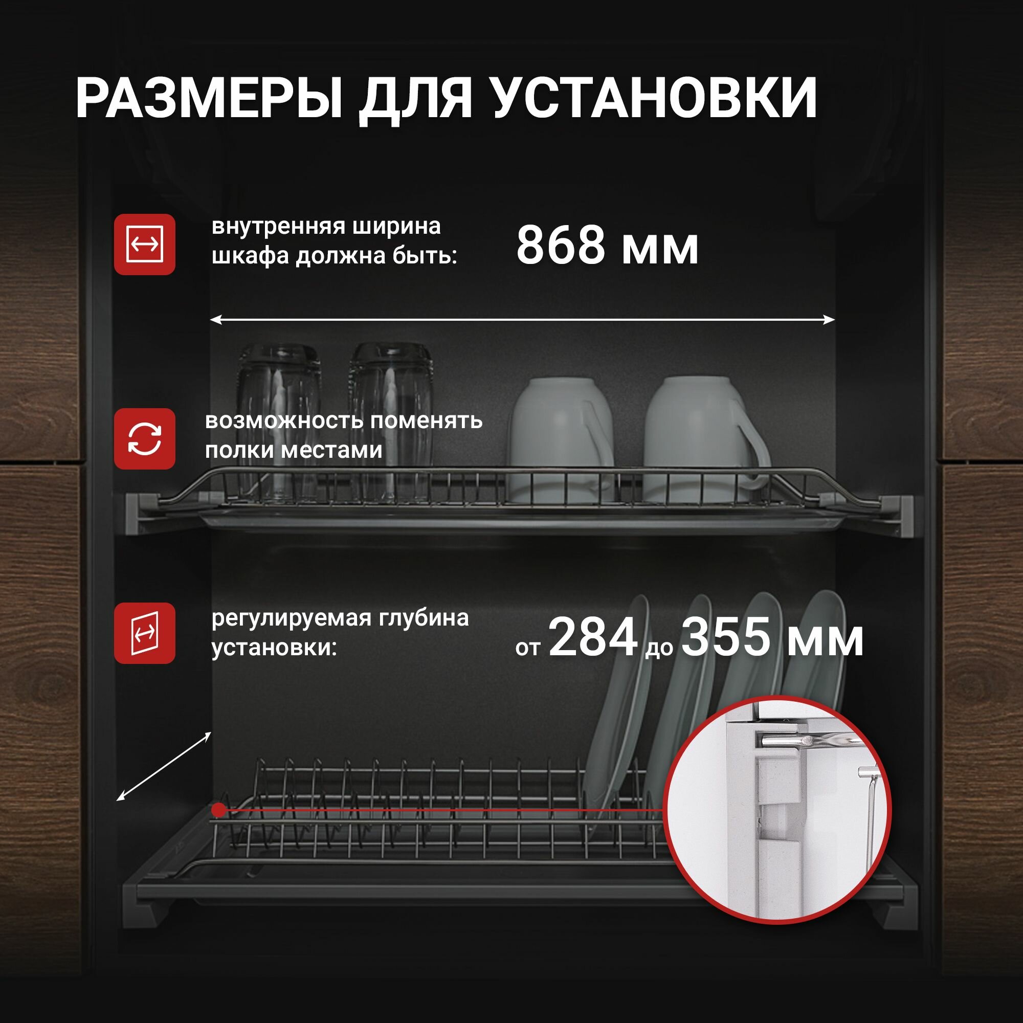 Удобная и прочная сушилка для посуды двухъярусная для шкафов глубиной для монтажа 284-355 мм и шириной 90 см (ширина шкафа вместе боковыми стенками 16 мм). Сушилка для посуды в шкаф усилена прутком жесткости и предназначена для установки в верхний модуль кухни. Сушилка для посуды в шкаф изготовлена из стали с гальваническим покрытием. Сочетает в себе прочность и стильный внешний вид, что делает её отличным дополнением к любой кухне, а рама выполнена из прочного качественного пластика. Качество сушилки соответствует известным европейским брендам. Данная модель сушилки для посуды легко устанавливается в шкаф, освобождает место на столешнице и помогает поддерживать порядок на кухне. Сушилка для посуды обеспечит вам комфорт при сушке тарелок, чашек и столовых приборов. Огромным преимуществом является два уровня, которые увеличивают ёмкость и позволяют сушить больше посуды одновременно. Оснащенная поддонами, она предотвращает попадание влаги на поверхность шкафа и продлевает срок его службы. Современный дизайн и качество материалов делают эту сушилку идеальным выбором для любой хозяйки. Сушилка не требует дополнительного ухода или обслуживания. Сушилка для посуды от Kalibra - это отличное решение для вашей кухни, которое впишется в любой интерьер кухни, обеспечивая практичность и эффектный вид одновременно.