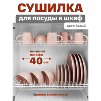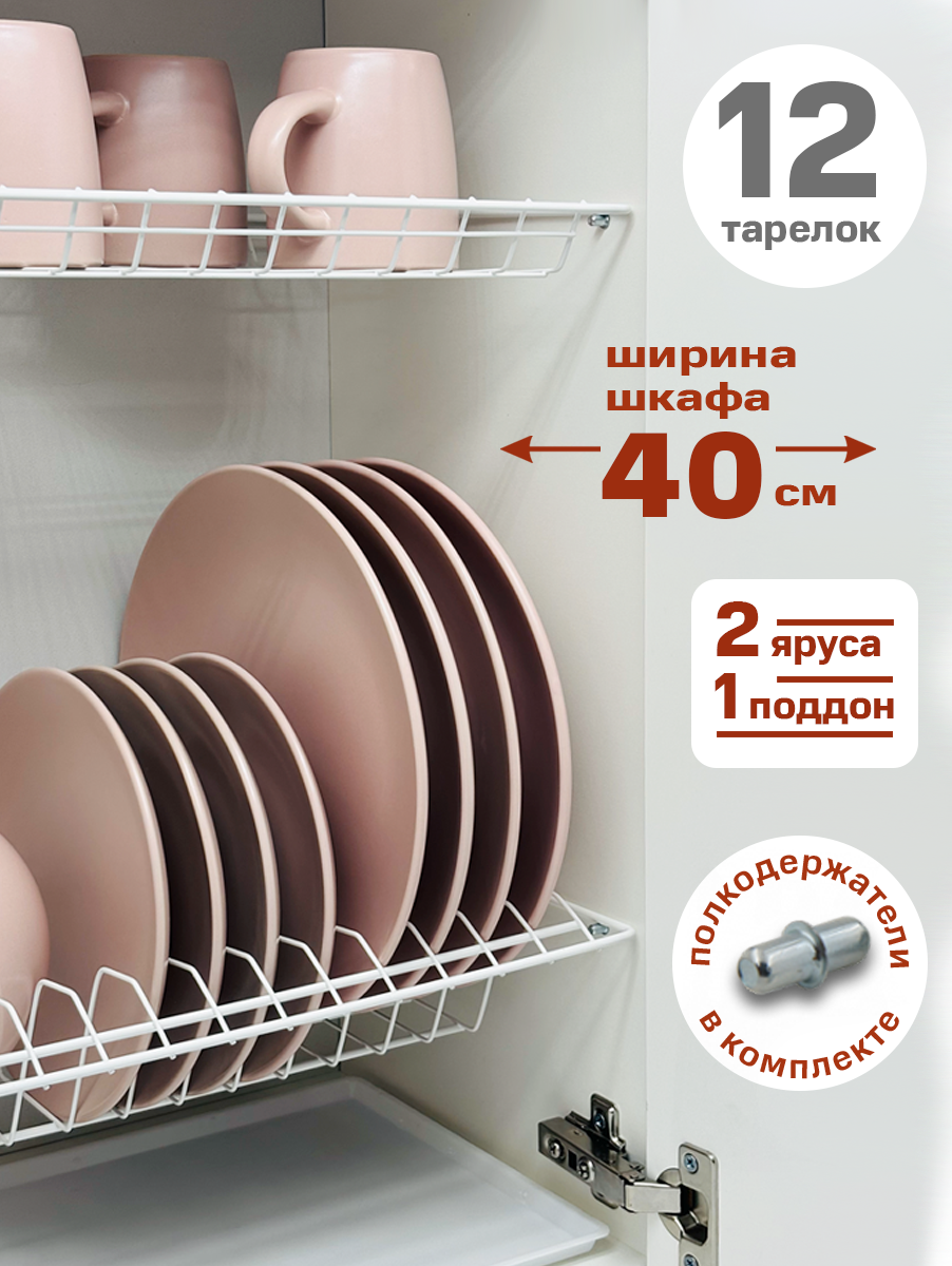 Посудосушитель в кухонный шкаф 40 см (внешний размер шкафа). В комплекте два яруса: для чашек и тарелок с одним пластиковым поддоном. Полкодержатели в коплекте. Размер 365х256 мм.