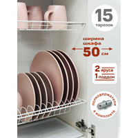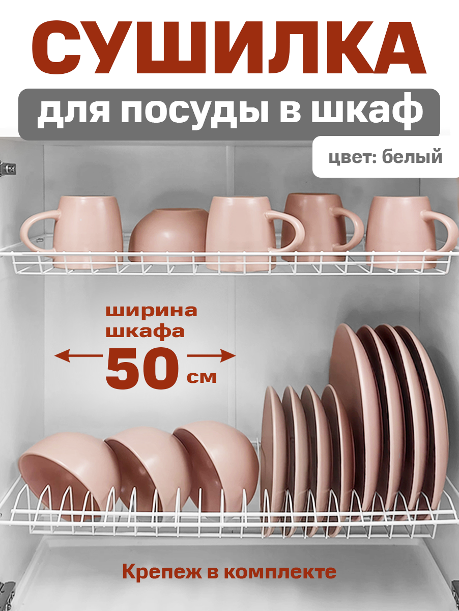 Посудосушитель в кухонный шкаф 50 см (внешний размер шкафа). В комплекте два яруса: для чашек и тарелок с одним пластиковым поддоном. Полкодержатели в коплекте. Размер 465х256 мм.