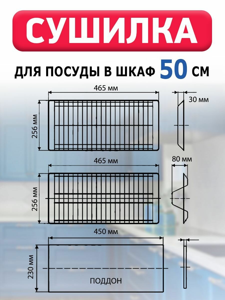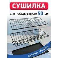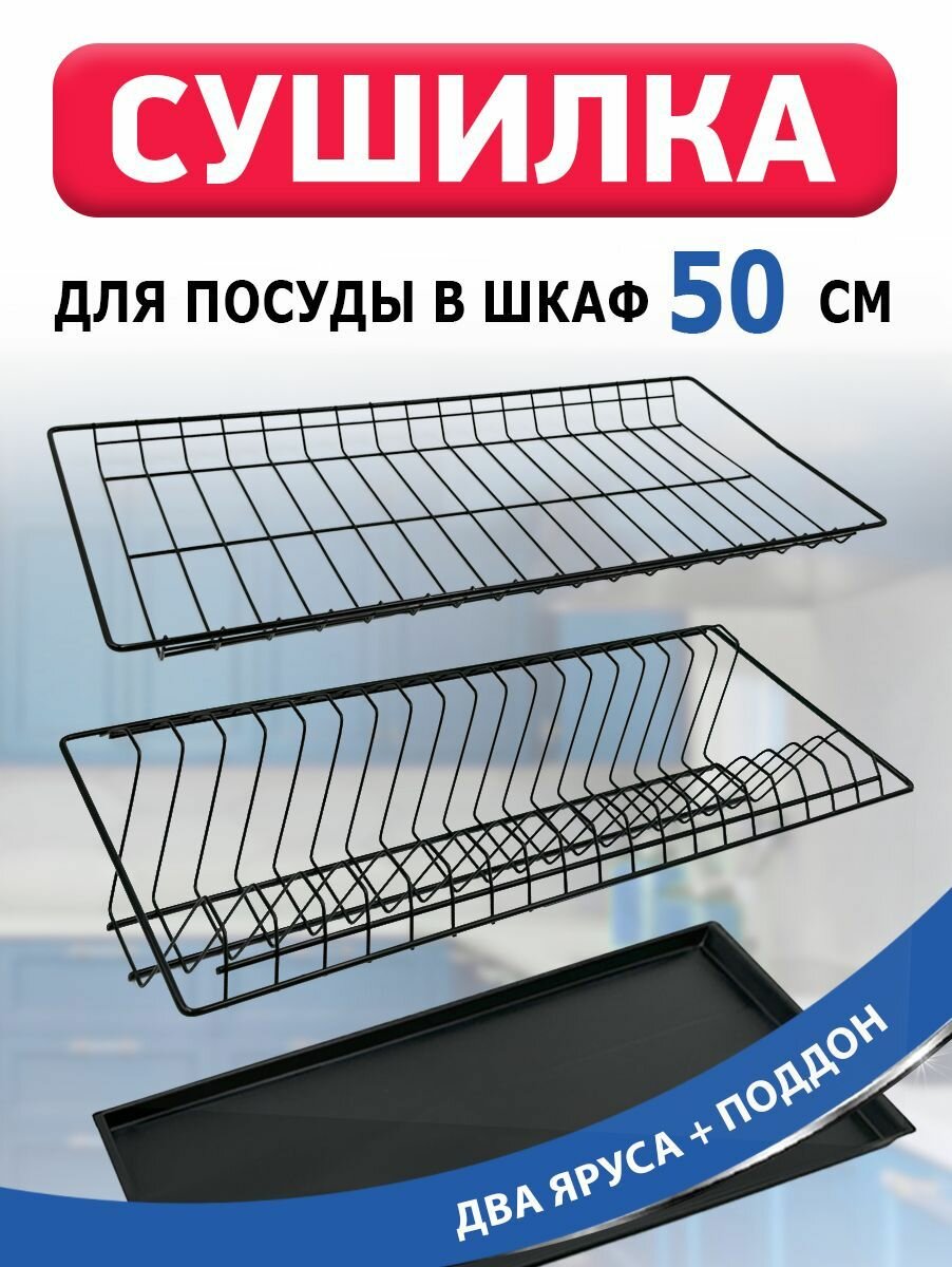 Посудосушитель в кухонный шкаф 50 см (внешний размер шкафа). В комплекте два яруса: для чашек и тарелок с одним пластиковым поддоном. Полкодержатели в коплекте. Размер 465х256 мм.