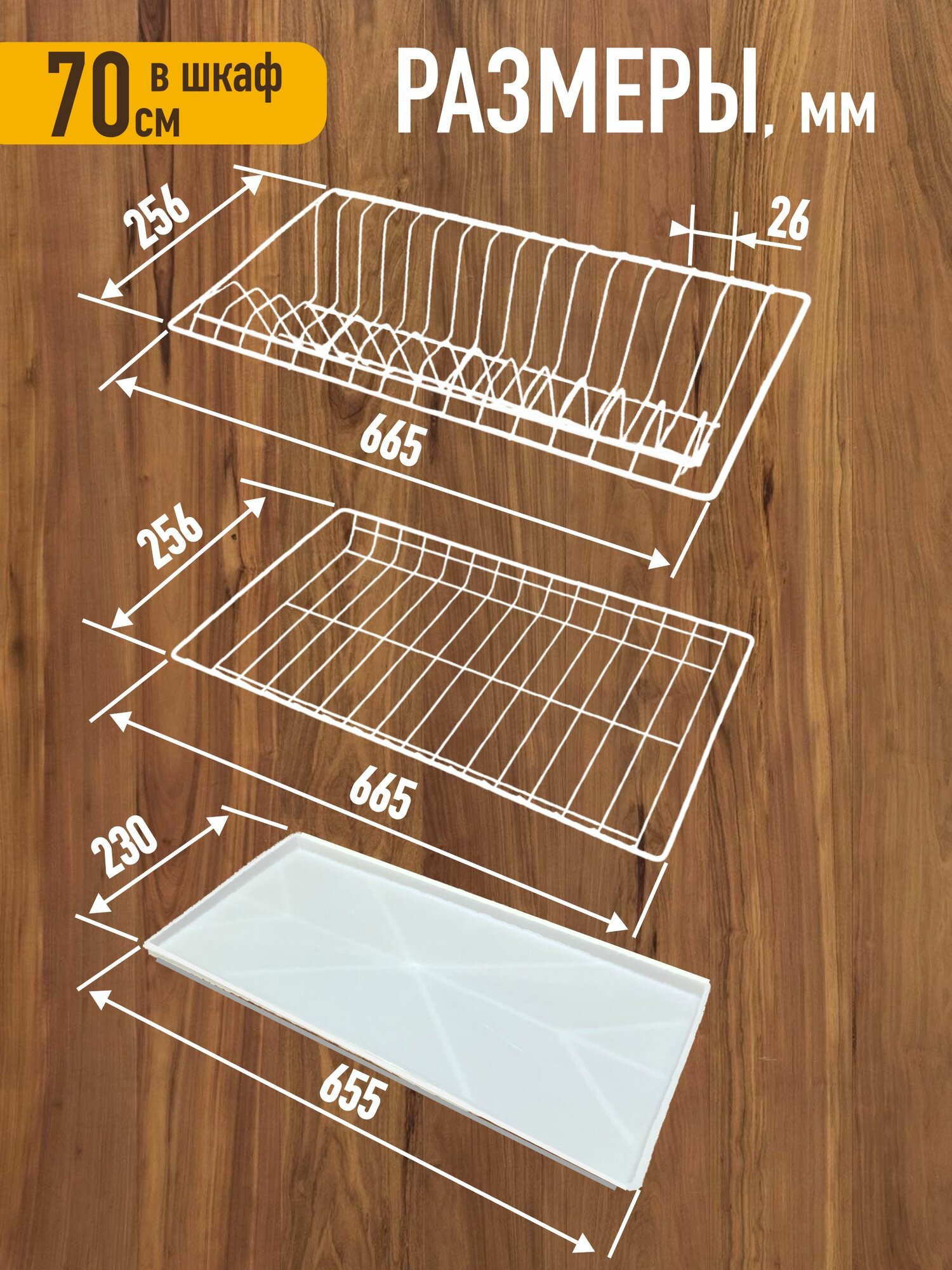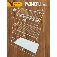 Посудосушитель в кухонный шкаф 70 см (внешний размер шкафа). В комплекте два яруса: для чашек и тарелок с одним пластиковым поддоном. Полкодержатели в комплекте. В наличии имеется три цвета: Белый, Хром, Черный. Размер 665х256 мм.
