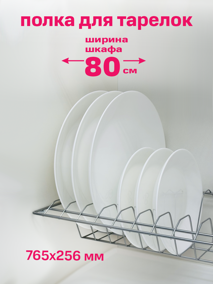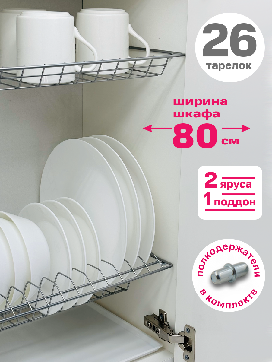 Посудосушитель в кухонный шкаф 80 см (внешний размер шкафа). В комплекте два яруса: для чашек и тарелок с одним пластиковым поддоном. Полкодержатели в коплекте. Размер 765х256 мм.