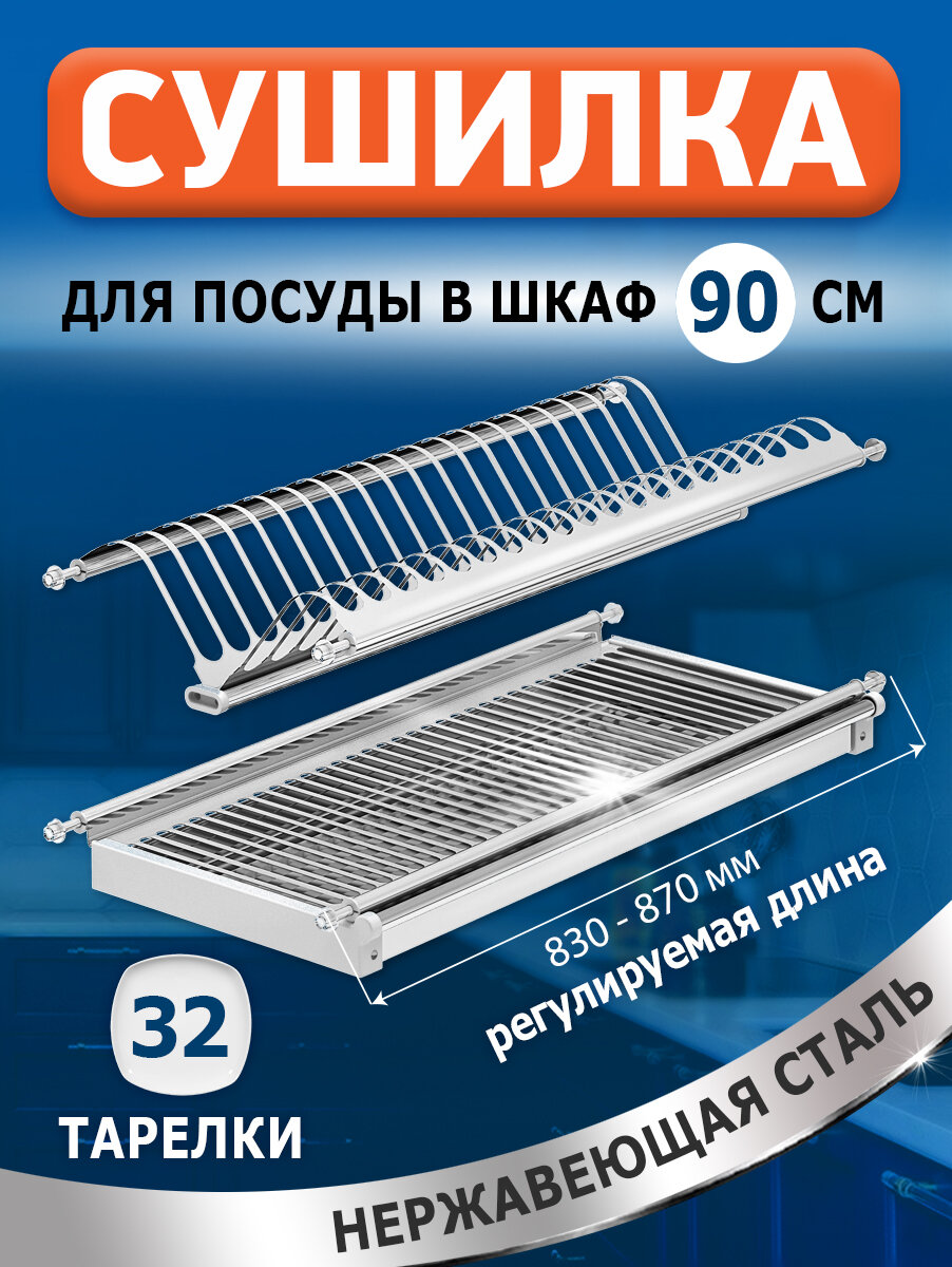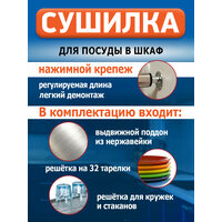 Двухуровневая встраиваемая сушилка для посуды в шкаф 900 мм с поддоном. (по фасаду, учтите это при покупке). Сушилка изготовлена из нержавеющей стали (марка стали AISI 201), что позволит ей прослужить долго и не ржаветь. Сушка для посуды в шкаф 90 см с поддоном с регулируемой длиной 830 - 870 мм, глубина 254 мм. Сушилка для тарелок имеет 32 деления. Посудосушитель устанавливается в кухонный шкаф для высушивания и хранения посуды. Для удобства использования сушилку для тарелок и бокалов можно установить в навесную полку над раковиной в кухонном шкафу. Сушка для посуды в базу 900 мм состоит из двух полок: верхняя полка используется, как сушка для тарелок и блюд сушилка для мисок и салатников для крышек от кастрюль. нижняя полка решетка с выдвижным металлическим поддоном используется как сушилка для бокалов и чашек для кружек и пиал, а также сушка для столовых приборов, сушилка для ложек ножек и вилок. Нержавеющая сушка для посуды оснащена прочными телескопическими стальными креплениями - держателями и выдерживает нагрузку до 7,5 кг на каждый уровень сушилки для кухни. Многофункциональная, прочная и стильная сушка для посуды из нержавеющей стали установленная в навесные полки для кухни, имеет стильный и современный дизайн, прекрасно впишется в интерьер вашей кухни и организует пространство в подвесном шкафу. Сушилки для посуды в шкаф можно использовать в шкафу без дна, а также вы можете поменять уровни места для удобства использования. Для правильного выбора размера сушки для посуды, замерьте внутренний размер шкафа, куда будет устанавливаться кухонная сушка для посуды и выберете нужный размер сушилки по схеме в карточке товар. Точные размеры указаны на фото 4. Перед установкой посудосушителя нужно просверлить 8 отверстий диаметром 10 мм, как указано в схеме (каждая сушилка для посуды комплектуется схемой по установке), легким движением зажать распорки и вставить в просверленные отверстия. Сушка устанавливается легко за 10 минут. Инструкция по установке на фото 2.