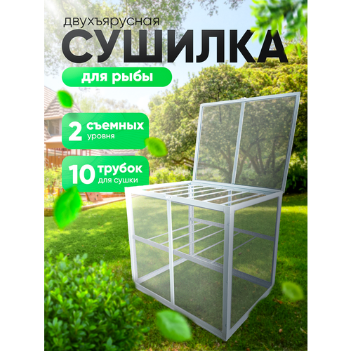 Сушилка для рыбы размер 70*60*50см. -Каркас металлический из алюминиевого профиля, сетка москитная из стекловолокна. -Конструкция разборная для удобства транспортировки. - В комплекте инструкция, саморезы. -Два уровня (съемные) для сушки на расстоянии 30см. 10 трубок для сушки рыбы, расстояние между ними 10 см. -Габариты позволяют размещать ее в любых местах таких как домах, балконах, брать с собой на рыбалку.