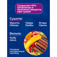 дополнительно электросушилка комплектуется а) одним съемным сетчатым поддоном для мелких продуктов и лучшего снятия липких и вязких продуктов после сушки б) одним съемным поддоном для приготовления фруктовой пастилы