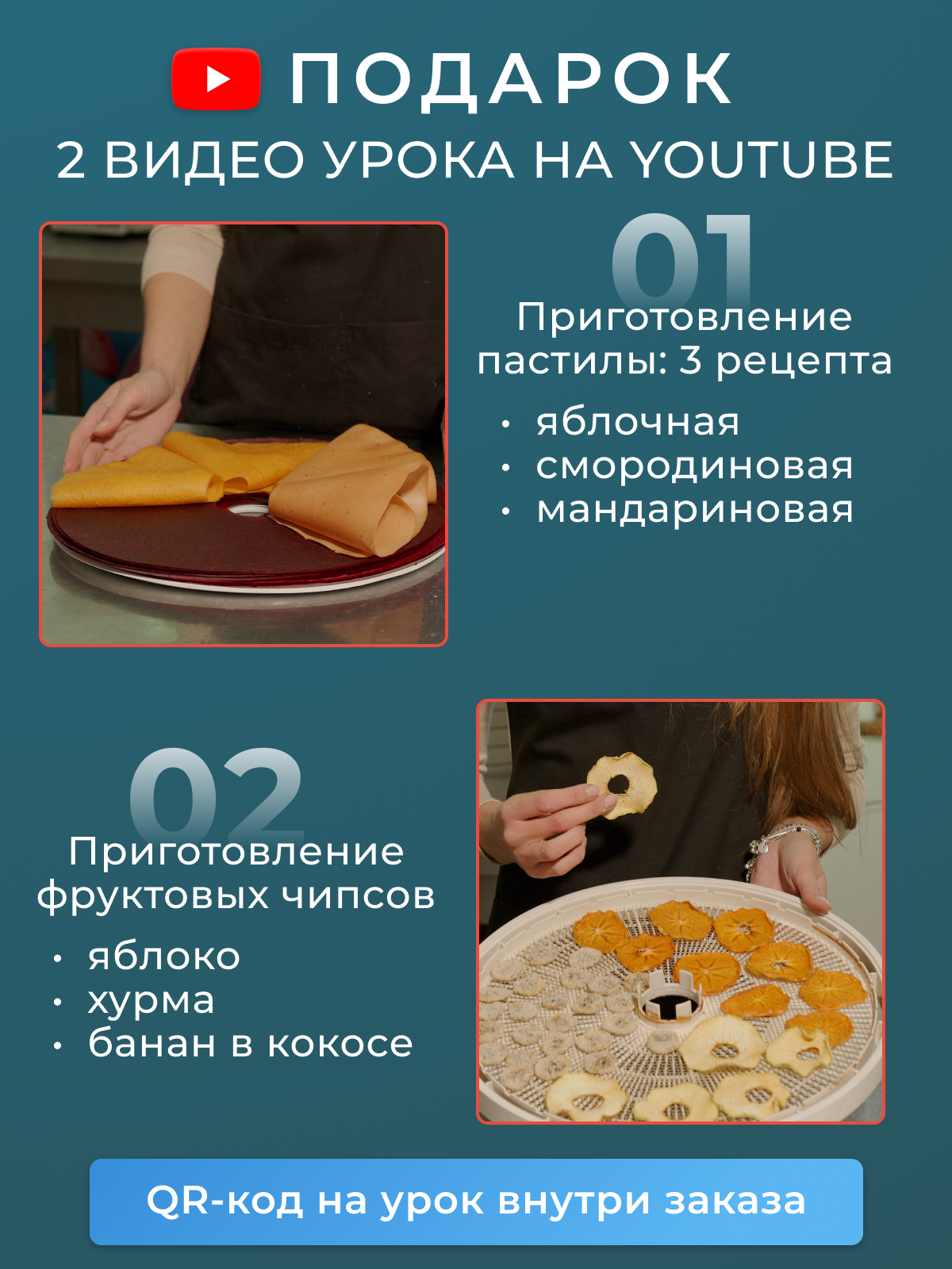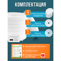 В комплекте 5 поддонов, 1 сетчатый лист, 1 лист для пастилы, кухонные весы В ПОДАРОК! Электронное управление, таймер до 48 ч, регулировка температуры 33-63 °C