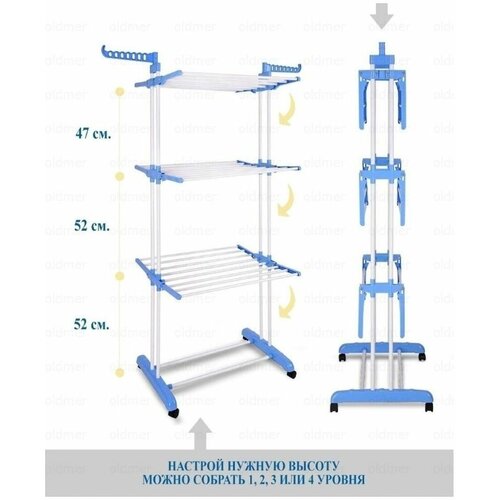 Сушилка оснащена 6 складными полками, подставкой для обуви и хранения вещей. Это позволяет разместить на ней не только одежду, но и постельное белье, нижнее белье и даже обувь.