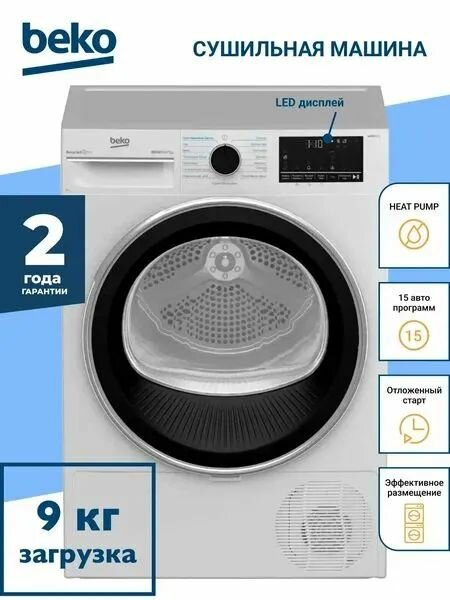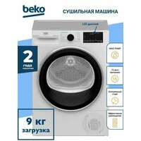 Сушильная машина белого цвета шириной 60 см с цифровым дисплеем и тепловым насосом. Большая вместимость до 9 кг позволяет легко высушить объемные вещи, например, комплект постельного белья. Имеет 15 автоматических программ, включая специальные режимы для хлопка, рубашек, джинс, полотенец, спортивной одежды, а также автоматический цикл разглаживания. Совместима со стиральными машинами Beko – приборы можно объединить в компактную колонну и полноценно использовать, не думая о поиске свободного места для сушки влажной одежды. Благодаря функции отложенного старта сушку белья можно запланировать на любое удобное время.