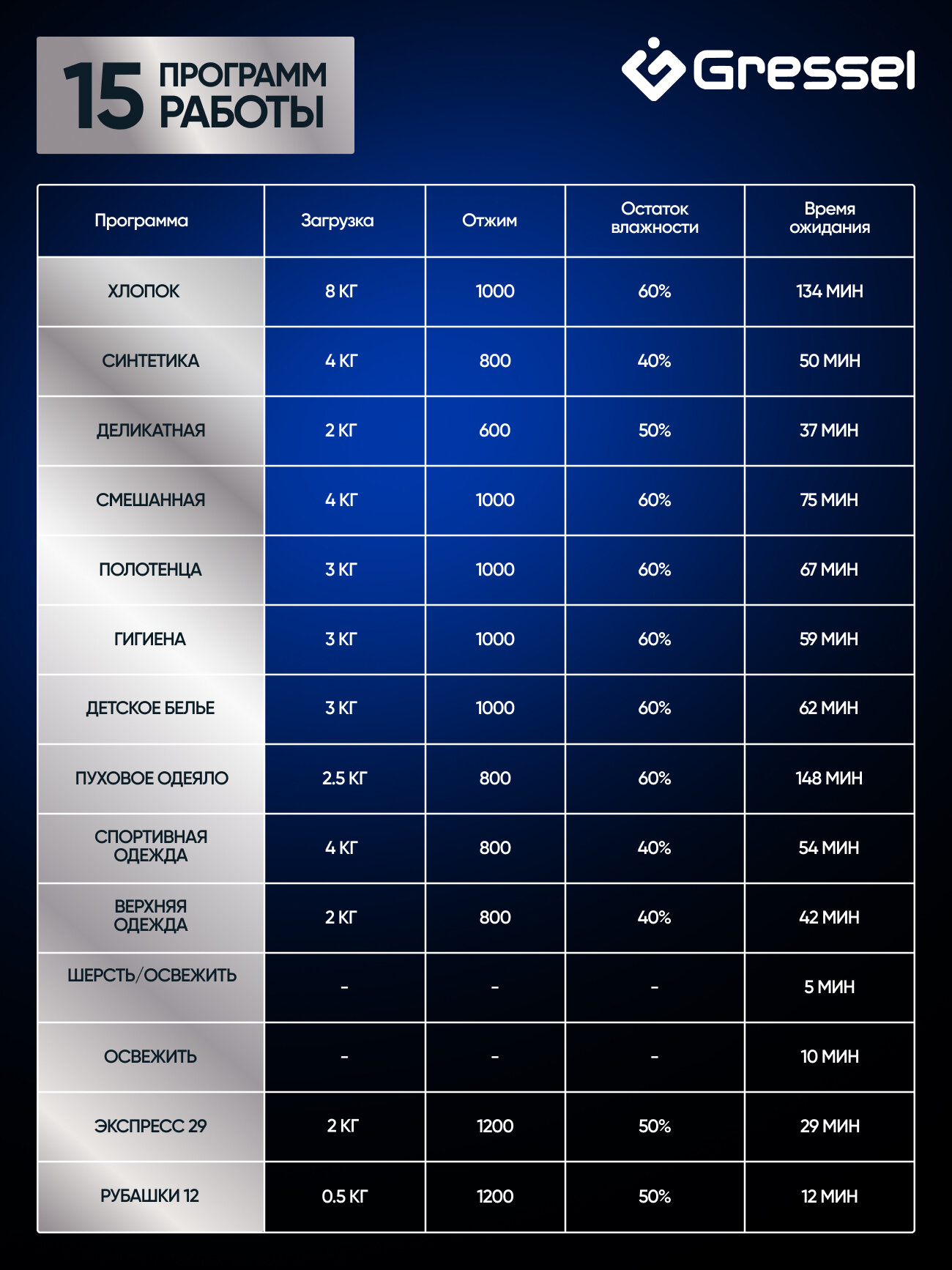 бережная сушка, сорочки (рубашки), шерсть, детское белье, одеяло, освежение, смешанные ткани, спорт, сушка в шкаф (синтетика), сушка в шкаф (хлопок), сушка под утюг (хлопок), экспресс 29, экстра сушка (хлопок)
