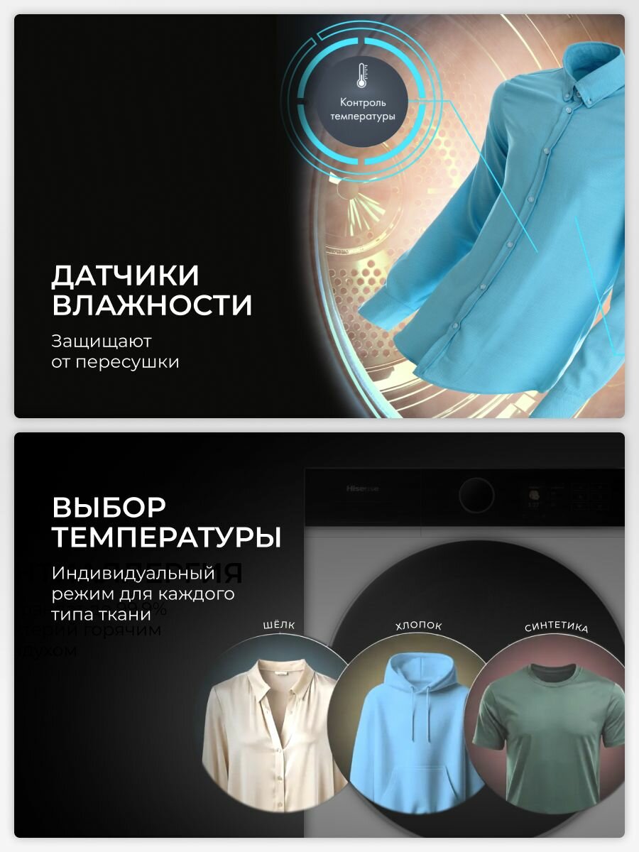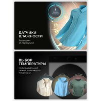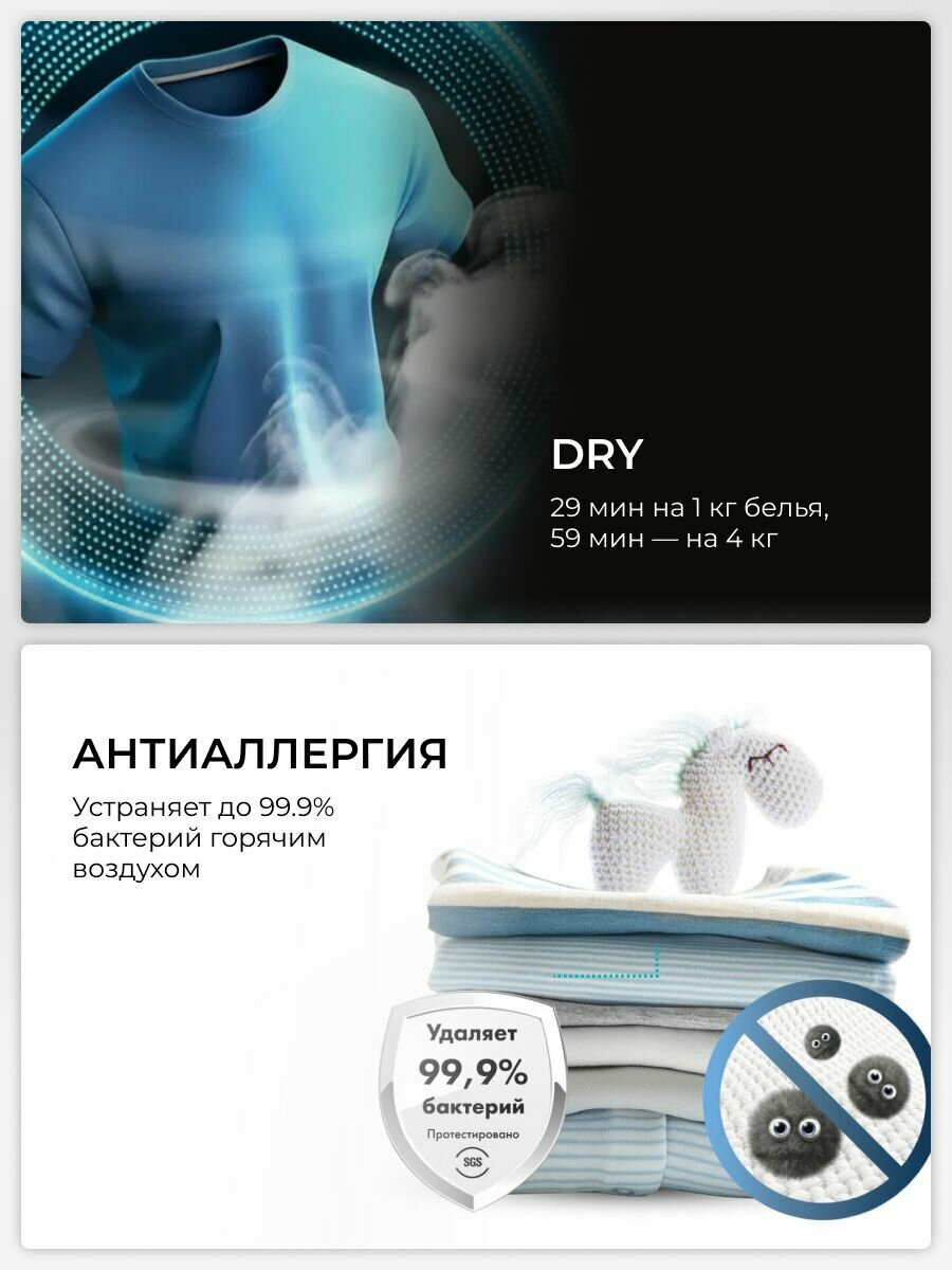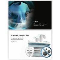 Быстрая сушка Сушильная машина серии 5i — это новый стандарт эффективности. Всего за 29 минут она может высушить 1 килограмм белья. Даже при большой загрузке (до 4 килограммов) ваши вещи будут сухими всего за 59 минут. Эта машина легко справляется с любой задачей, будь то пара футболок или белье для всей семьи. Мягкость, свежесть и бережный уход Функция iCare позволяет обрабатывать ткань холодным паром, проникающим в волокна во время циклов сушки. Сочетание пара и высокотемпературного вращения помогает уменьшить количество складок, смягчить ткани и устранить запахи. Точный контроль Сушильная машина оснащена двумя высокоточными датчиками, которые отслеживают остаточную влажность и температуру белья. На основе этих данных машина автоматически корректирует время сушки. Это предотвращает пересушивание и повреждение волокон ткани из-за излишнего нагрева, помогая вашей одежде служить дольше. Уничтожение 99,99% аллергенов Программа «Антиаллергия» дезинфицирует одежду горячим воздухом, эффективно уничтожая 99,99%* вредных бактерий, включая кишечную палочку и золотистый стафилококк. Это гарантирует безупречную чистоту вашей одежды без снижения качества сушки. От стирки до сушки — одним касанием Стиральная машина дублирует программу стирки на сушильную машину*, которая в соответствии с этим автоматически подбирает программу сушки, чтобы вы не тратили время на дополнительные действия.
