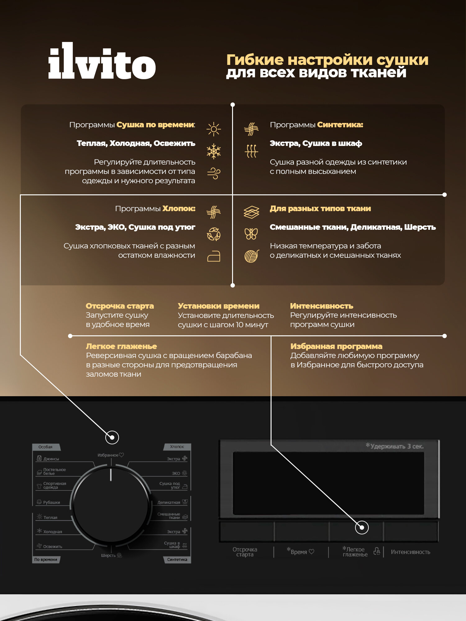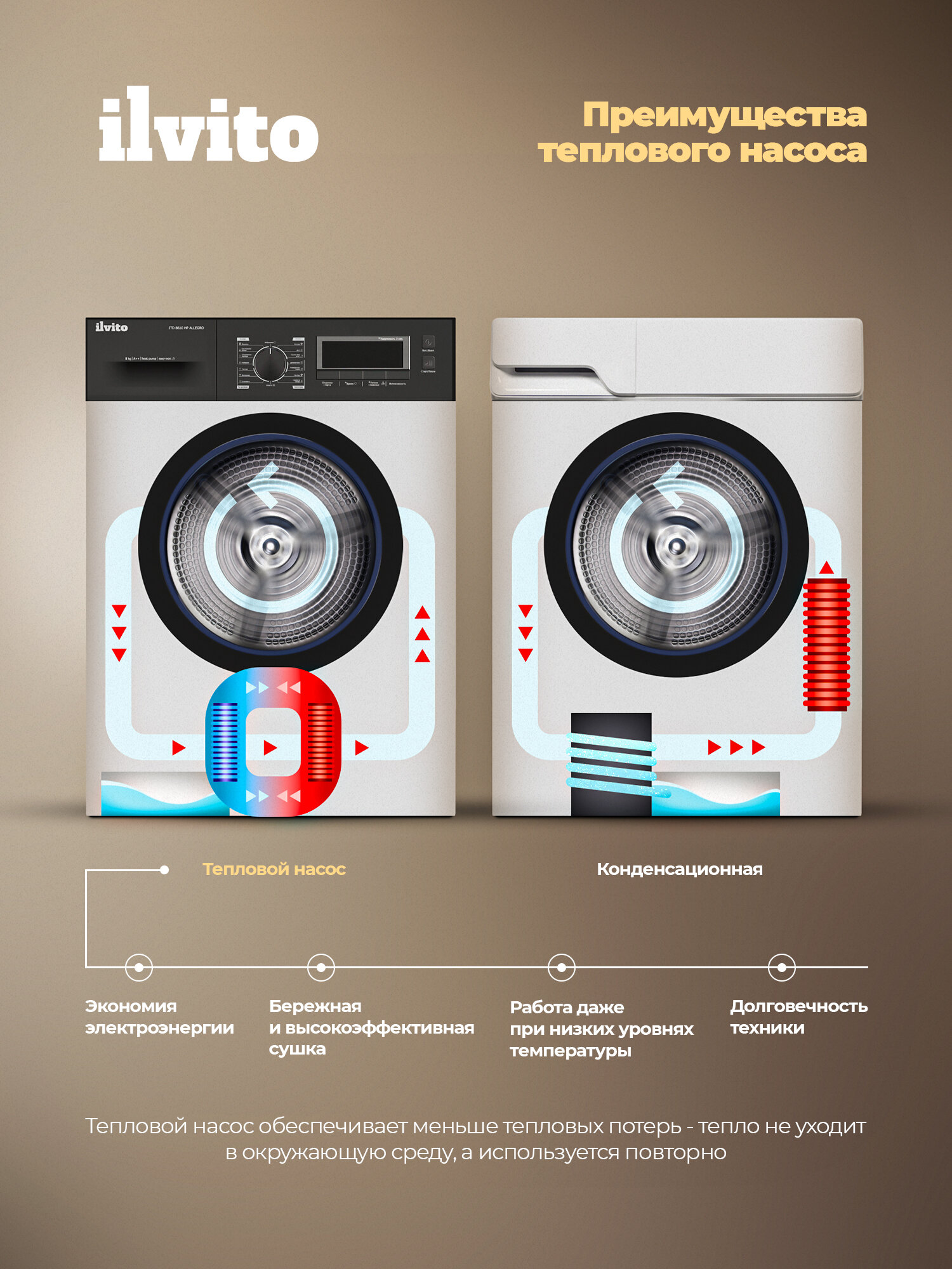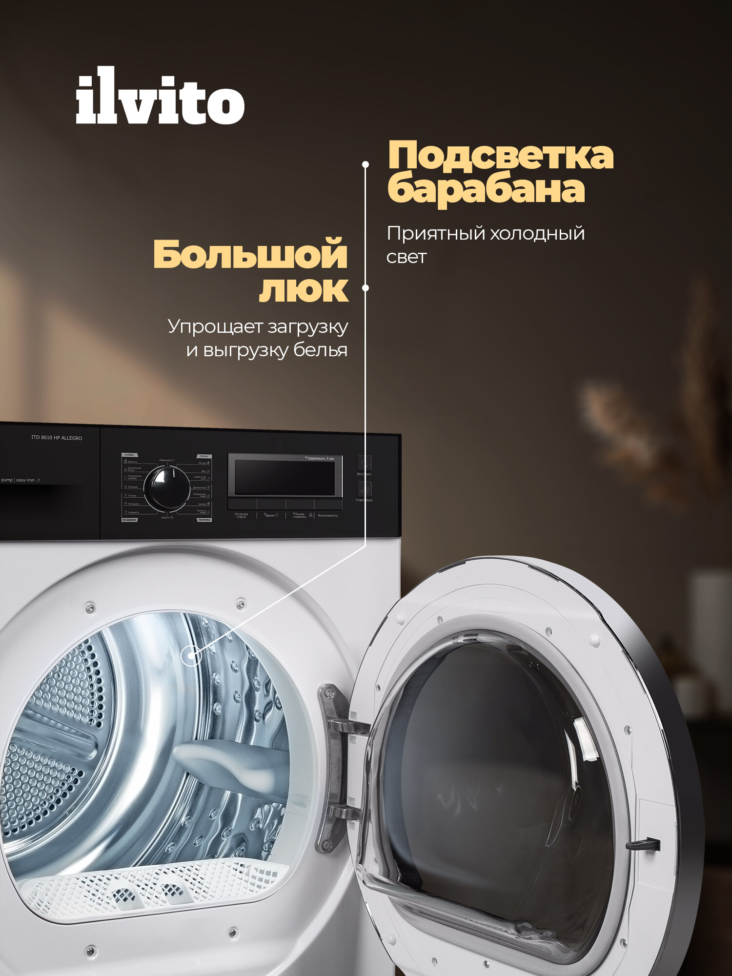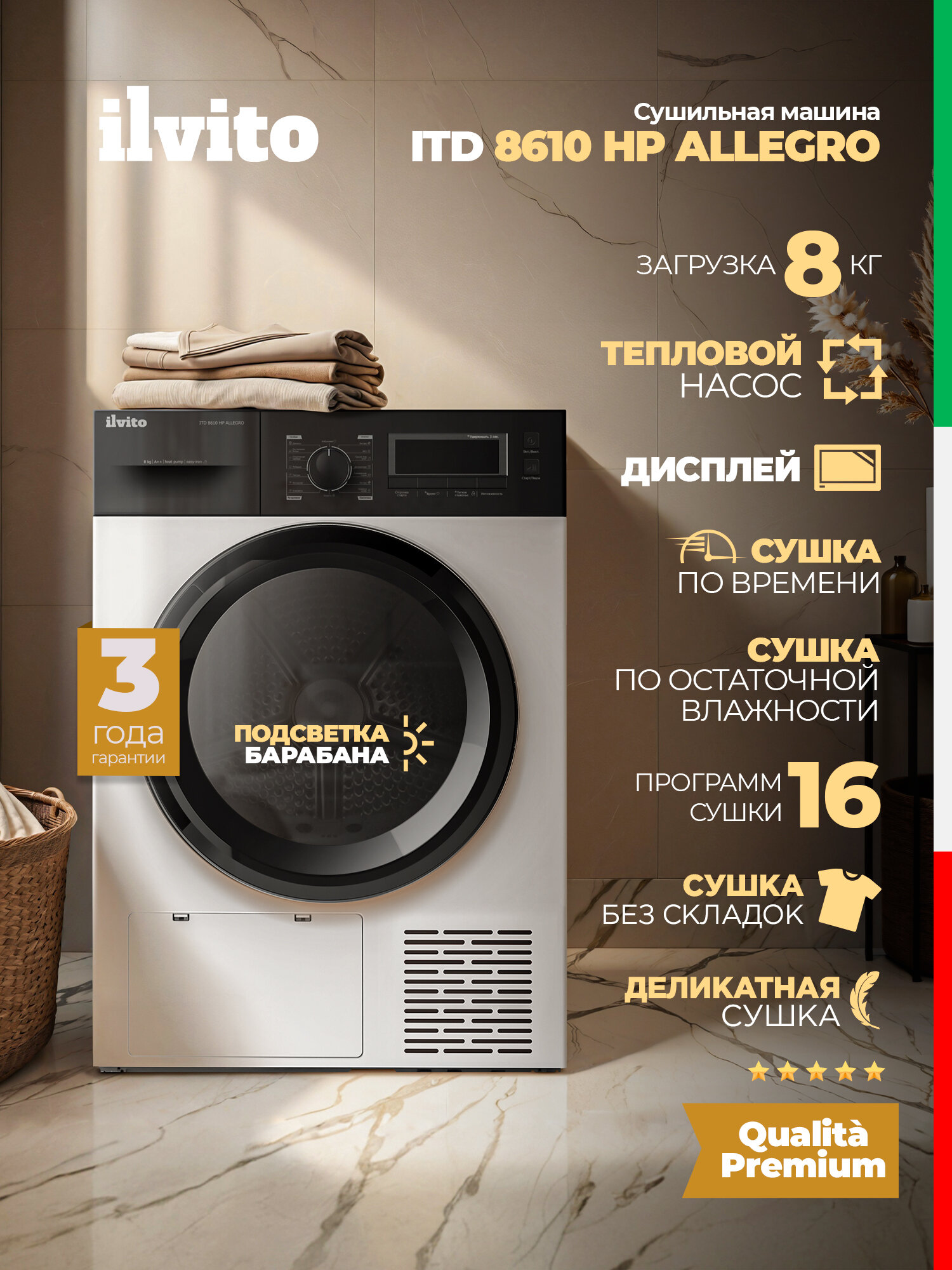 Сушильная машина с тепловым насосом ILVITO ITD 8610 HP ALLEGRO (Модель 2025 г.) 8 кг, подсветка барабана: сравнение цен, характеристики, фото, актуальное наличие и цены.