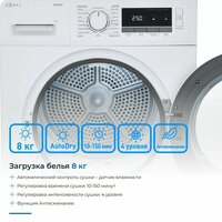 Общие данные: Габариты: 84.5x59.5x65 см Максимальная загрузка: 8 кг Класс энергоэффективности: A++ Программы: Джинсы/Постельное белье/Спорт/Рубашки/Теплый воздух/Холодный воздух/Освежение паром/Очень сухое (Хлопок)/В шкаф (Хлопок)/Под утюг (Хлопок)/Деликатная/Смешанные ткани/Очень сухое (Синтетика)/Под утюг (Синтетика)/Шерсть/Моя программа Дополнительные функции: Регулировка времени сушки: 10-150 минут Регулировка интенсивности сушки: 4 уровня Режим «Моя программа» Функция Антисминание Таймер (отложенный старт): до 24 часов Управление и индикация: LED-дисплей LED-индикаторы Внутренняя подсветка Системы безопасности: Блокировка панели (Защита от детей) Дополнительная информация: Монтаж: в колонну со стиральной машиной Тип двигателя: стандартный Тип сушки: конденсационная с тепловым насосом (Heat Pump) Контроль сушки: автоматический (датчик влажности) Класс эффективности конденсации: В Потребляемая мощность: 800 Вт Уровень шума: 69 дБ Длина сетевого шнура: 1.5 м Реверсивное вращение барабана Открывание дверцы на 180° Смотровое окно на дверце Материал барабана: оцинкованная сталь Подключение к водопроводу: не требуется