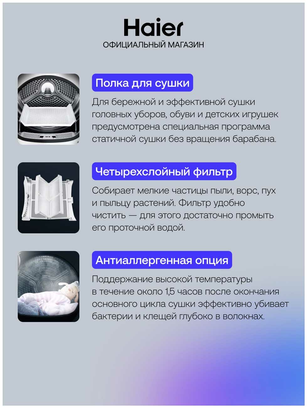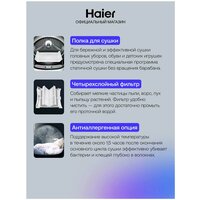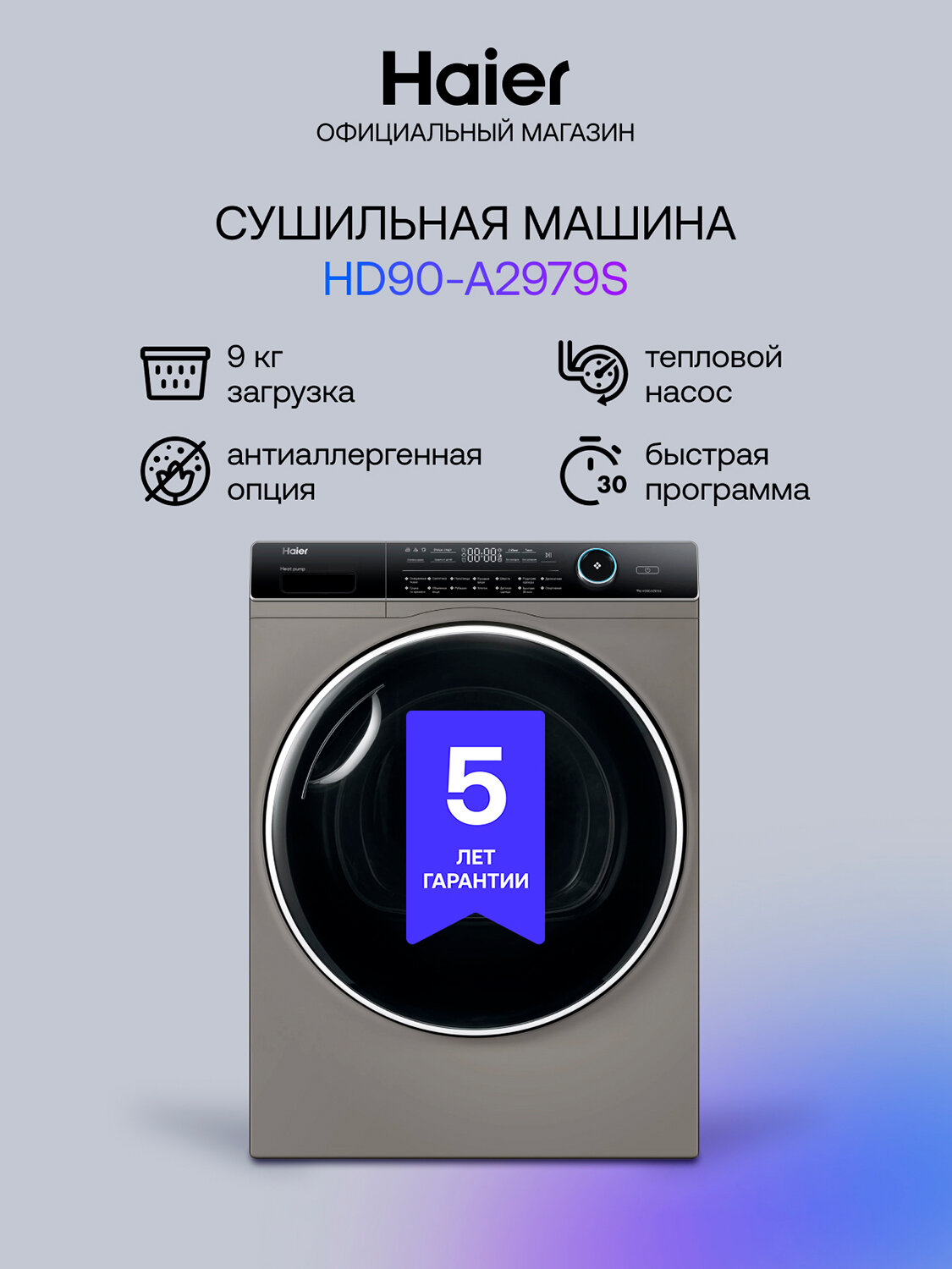 Сушильная машина Haier HD90-A2979S быстро и бережно приведет ваши вещи в порядок. Широкие возможностисушильная машина оснащена различными программами для вашего комфорта. Режим подогрева, например, подарит вам сухую и теплую одежду перед выходом на улицу зимой. А сушка в шкаф разгладит все складки и позволит убрать одежду сразу, без глажки. Без складок! Благодаря реверсивному вращению барабана ваши вещи равномерно просушатся и разгладятся - на одежде не будет складок! Высокая надежностьчетырехслойный фильтр эффективно задержит мельчайшие частицы пыли, ворс, пух и пыльцу растений. А специальная антиаллергенная сушка при длительной высокой температуре уничтожит бактерии и клещей. Ваше здоровье под надежной защитой!