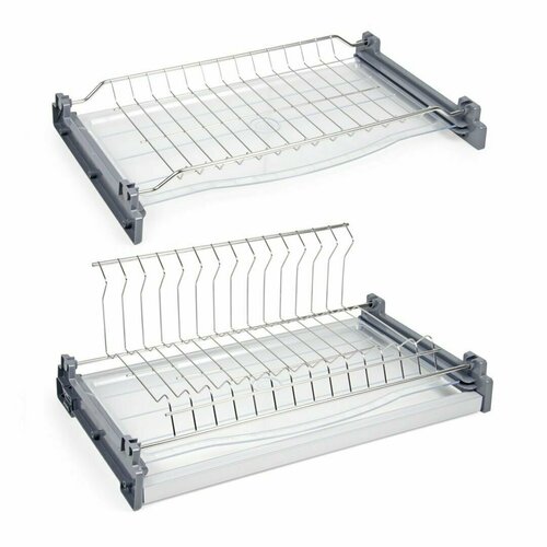LORA SU06 — двухуровневая сушка для посуды из нержавеющей стали с нижним ярусом L-образной формы для более стабильного удержания разноформатных тарелок. Модель имеет два плотных поддона под каждым уровнем для сбора капель воды, стекающих с посуды. Нижний ярус оснащён поперечным прутком, который препятствует проваливанию маленьких блюдец.