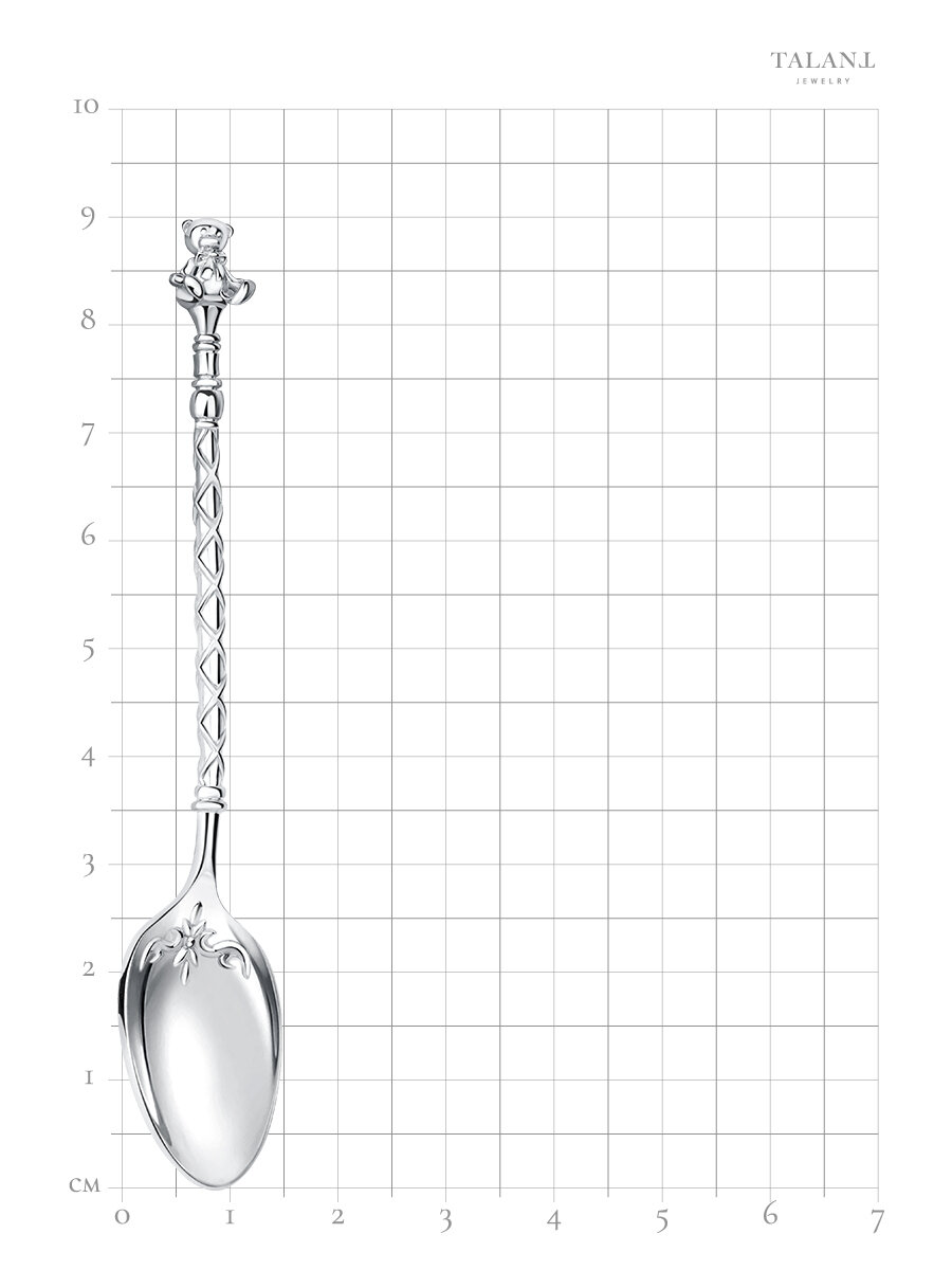 Ложечка серебряная с декоративным элементом в форме мишки. Серебряная ложка - памятный подарок ребенку, малышу на крещение, первый зубик или день рождения. Обладает элегантным дизайном. Может стать замечательным подарком близкому человеку, который ценит качество и стиль. Идеально подходит для чайной церемонии, кормелнии малыша или просто для украшения сервировочного стола. Изделие выполнено из серебра 925 пробы. Размеры ложки: в длину - 9 см, длина и ширина черпака - 3*1,5 см. Подарок ребенку на крещение или на первый зубик. Подлинность изделия подтверждается: именником производителя, биркой и пломбой завода. Обратите внимание, фактический вес изделия может отличаться от среднего, указанного в характеристиках. О заводе: Санкт-Петербургский Ювелирный Завод TALANT - это крупный производитель по-настоящему качественной ювелирной продукции.