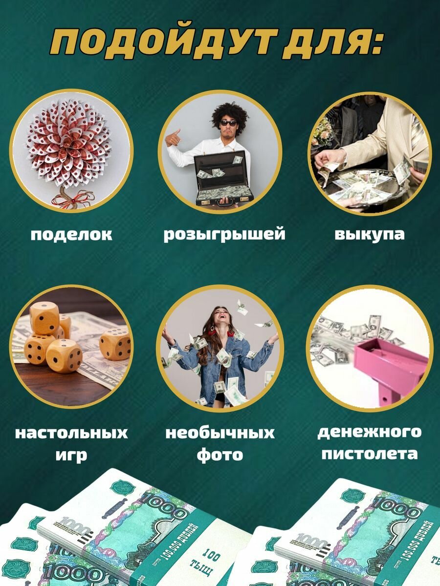 | Дополнительная информация | Хотите порадовать своих близких и друзей ярким и увлекательным подарком? Представляем Вам наши фантастические игрушечные деньги, которые станут настоящей находкой для Вас! Собственное производство и детальная проработка каждого элемента сувенирных денег делает их похожими на настоящие! Наш увлекательный набор фальшивых денег станет идеальным дополнением к различным играм в магазин, ресторан или банк. Реалистичные детали на каждой купюре создают иллюзию настоящих денег, позволяя не только повеселиться, но и развить воображение и фантазию. Каждая купюра яркая и безопасна для использования.Наши игрушечные деньги сделаны из высококачественных материалов,что позволяет сохранять свою привлекательность и целостность, выдерживая многочисленные игры. |