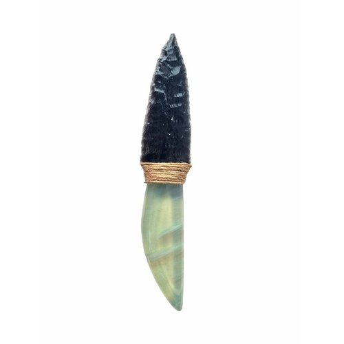 Лезвие ножа изготовлено из застывшей вулканической лавы – Обсидиана. В далекие времена Обсидиан использовали в изготовлении оружия, орудий труда и украшений. Его ценили за прочность и острые края, которые получались при его раскалывании. Нож из Обсидиана использовался в быту, на охоте, и был незаменимым спутником древнего человека.