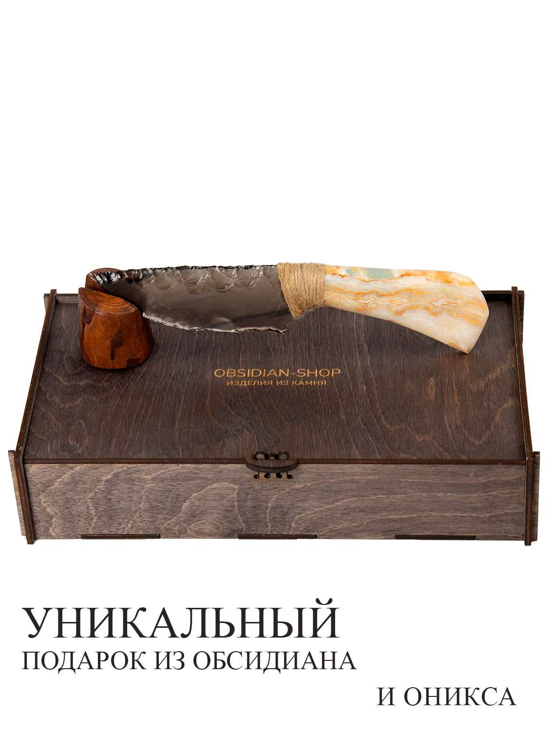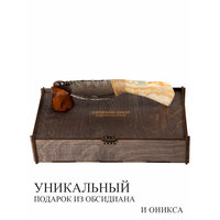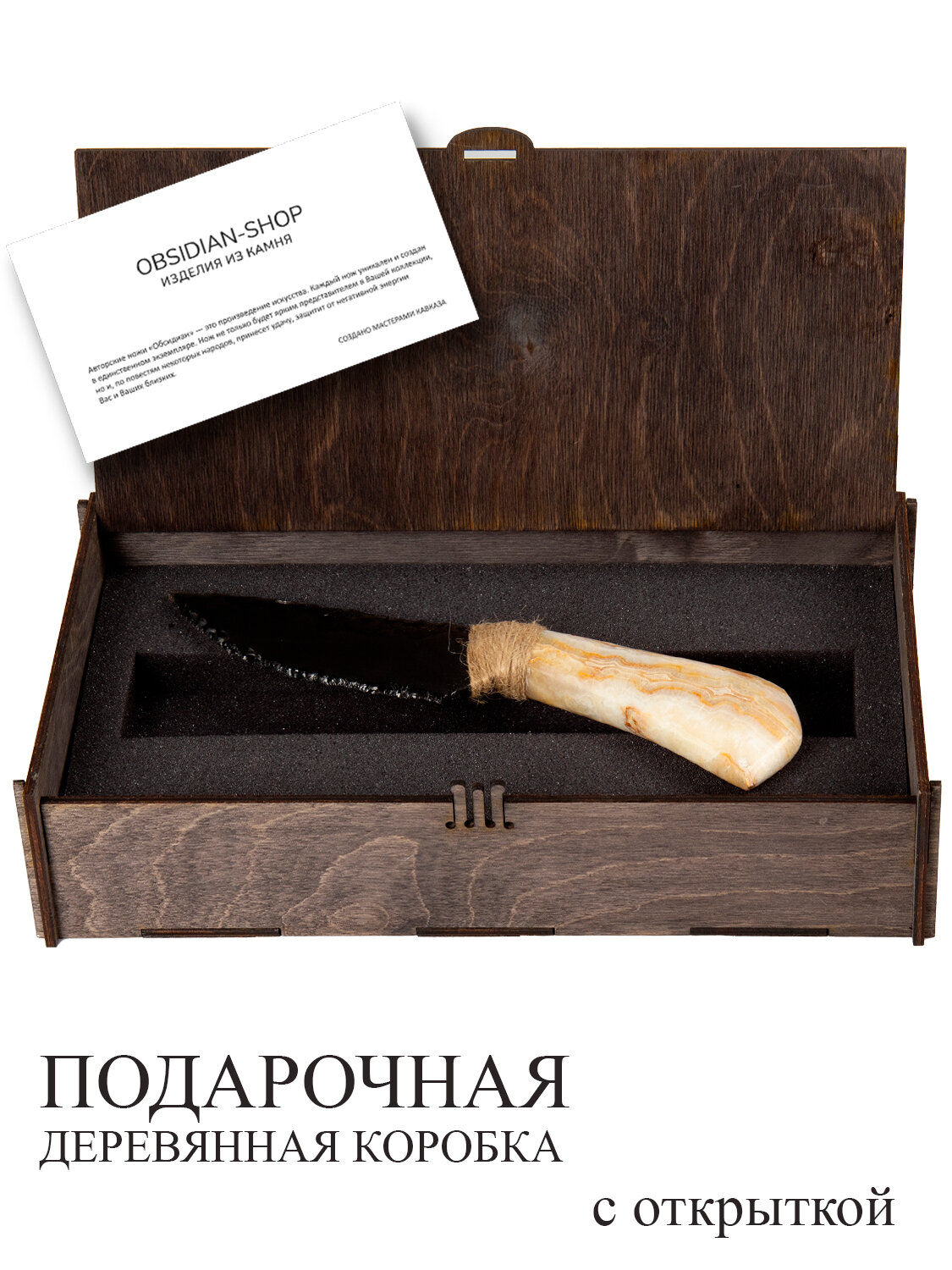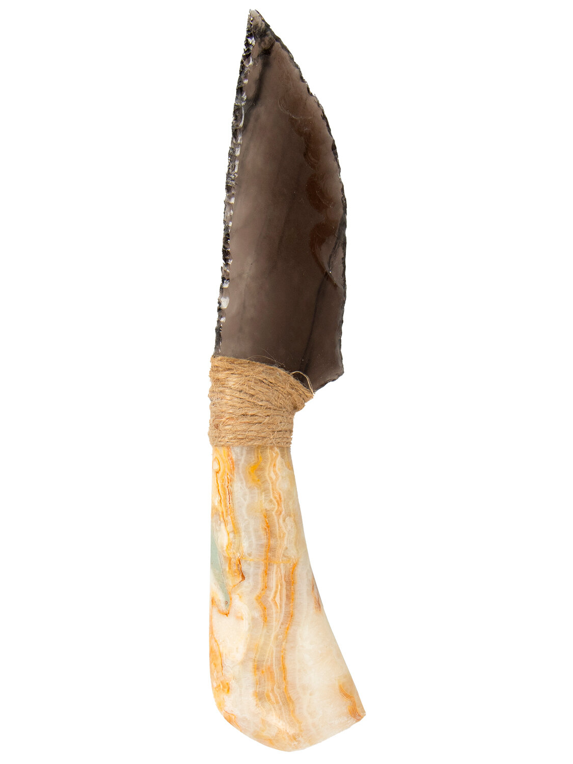 Рукоятка ножа изготовлена из коричневого Оникса - полудрагоценного камня, который с давних времен используется в ювелирном искусстве, и декоративном оформлении. Говорят, что дворец царя Соломона был сделан полностью из Оникса.