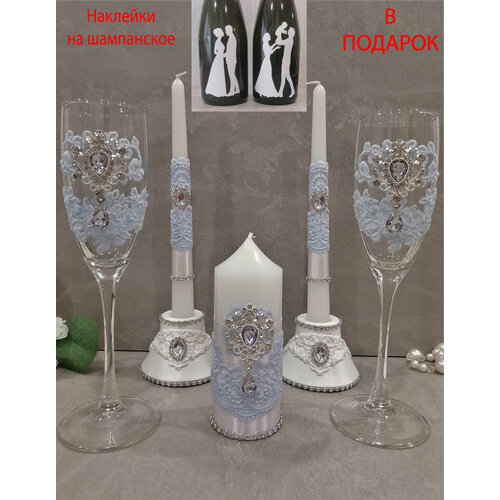 Набор свадебных аксессуаров "Голубые свечи" - это изысканное и стильное решение для вашего торжества. В комплект входят 2 бокала высотой 23 см и объемом 170 мл, 1 свеча-столбик и 2 античных свечи высотой 23 см, 2 гипсовых подсвечника и наклейки на 2 бутылки.
