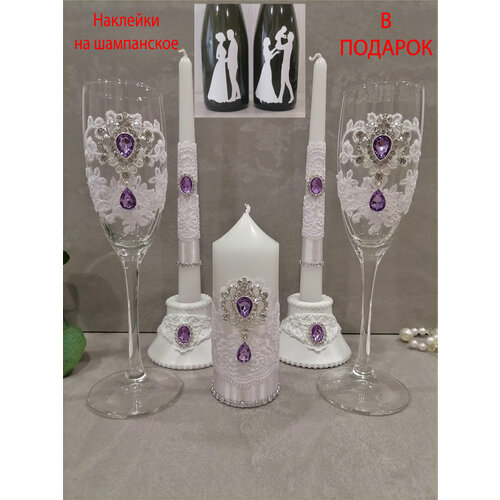 Набор свадебных аксессуаров "Сиреневые свечи" - это изысканное и стильное решение для оформления вашего торжества. В комплект входят 2 бокала высотой 23 см и объемом 170 мл, 1 свеча-столбик, 2 античных свечи высотой 23 см, 2 гипсовых подсвечника и наклейки на 2 бутылки.