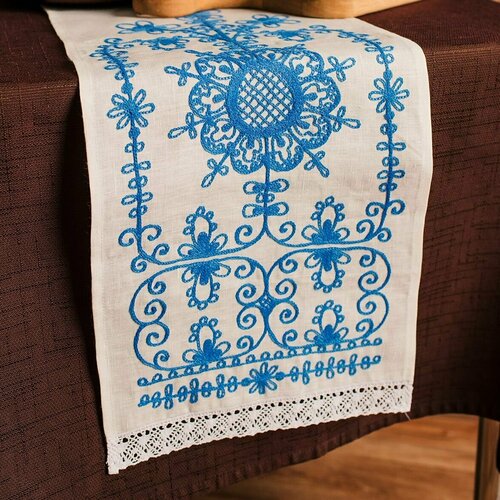 Лен 100% белый (не белоснежный), вышивка ярко синей ниткой.