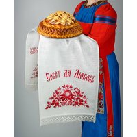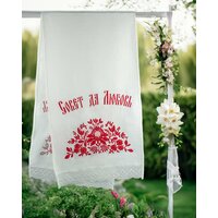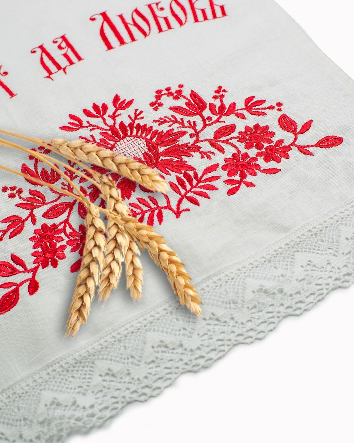 Рушник выполнен из высококачественного белоснежного льна. Ткань мягкая, приятная на ощупь. Размеры рушника 42х154 см, длина и ширина кратны 7. Полотно цельное, подшито со всех сторон. По краям рушника пришито широкое кружево. С двух сторон рушника украшает вышивка гладью. Рушник вышит нитью, которая не линяет и выдерживает высокую температуру, можно гладить вышивку с лицевой стороны.
