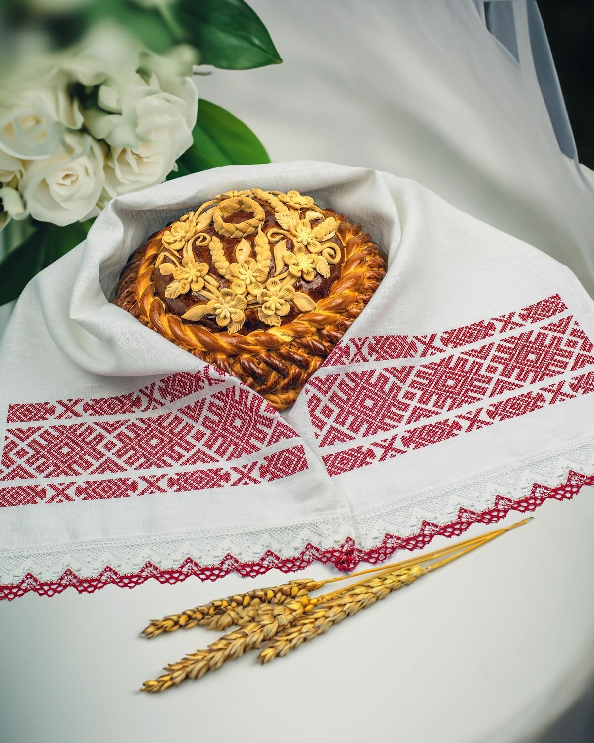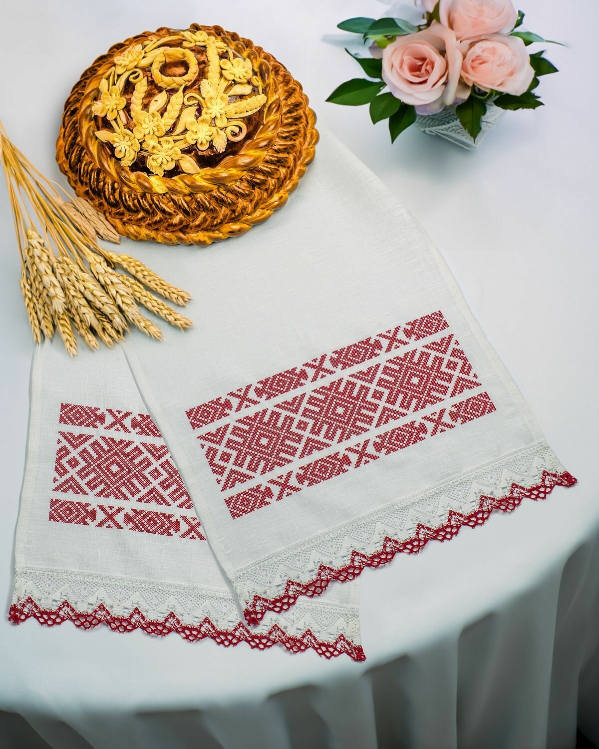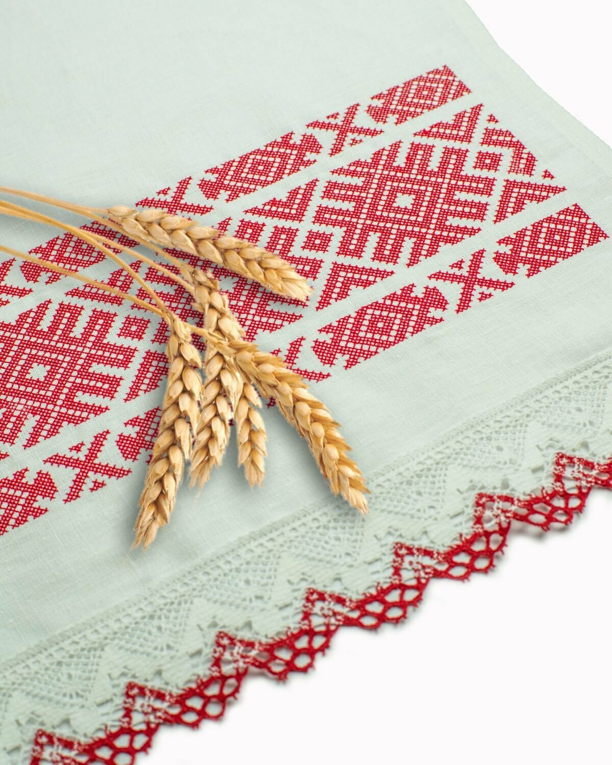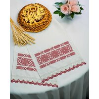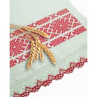 Рушник выполнен из высококачественного белоснежного льна. Ткань мягкая, приятная на ощупь. Размеры рушника 42х154 см, длина и ширина кратны 7. Полотно цельное, подшито со всех сторон. По краям рушника пришито широкое кружево. С двух сторон рушника украшает вышивка гладью. Рушник вышит нитью, которая не линяет и выдерживает высокую температуру, можно гладить вышивку с лицевой стороны.