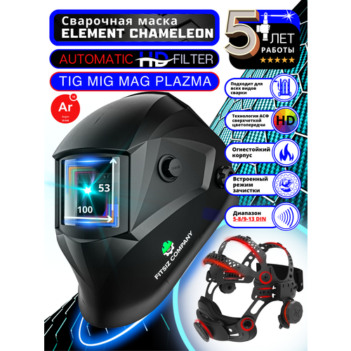 Маска для сварщика хамелеон серии Элемент - эффективно защищает глаза, кожу лица и шеи от ожогов, УФ излучения, ИК света, искр, брызг металла и высоких температур при проведении сварочных работ. Сверхпрочный корпус из термостойкого пластика с общим весом в 420 г. Дополнительная опция маски хамелеон режим шлифовки GRIND, с которым комфортно выполнять зачистку детали не снимая щиток сварщика. Маска сварщика хамелеон имеет удобный реечный наголовник, это позволяет регулировать удаленность маски асф от лица, высоту посадки маски на голове и размер, настроить маску наиболее комфортно для себя. Область применения: MMA, MIG- Plasma, сварочный аппарат инверторный, полуавтомат. Регулировка затемнения: 9-13DIN. В осветленном состоянии: 4 DIN. Время срабатывания 1/30000 сек. Внешняя регулировка чувствительности. Регулировка задержки осветления. Сенсоры 4 шт. Оптический класс: 1/1/1/2. Сменная+солнечная батарея гарантия стабильной работы. Гарантия - 12 мес. Удобный короб для хранения и транспортировки. Теги: сварочная маска хамелеон, сварочная маска хамелион, подарок мужу на день рождение, маски сварочные, сварочная маска для сварки, сварочные маски хамелеон, маска сварщика, светофильтр для сварочной маски, маска для сварки хамелеон, щиток защитный для лица, сварочная спецодежда, светофильтр защитный экран для лица, хамелеон светофильтр для сварщика, щиток сварщика, спецодежда сварщика, маски сварщика хамелеон полуавтомат, сварка, сварочное оборудование, сварочный аппарат, экран маска для сварщика, щиток для лица защитный, экран для батареи сварка, полуавтомат экран защитный, дуговая маска с фильтром, светофильтр АСФ для маски, аппарат для масок, защитный щиток для лица, маски с фильтром, автоматический светофильтр, для мужчины, подарок сварщику, подарок на дачу, подарок в гараж, подарок любимому мужу, подарок папе, подарок сыну, подарок на 23 февраля.