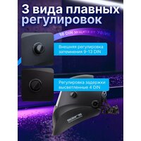 Маска для сварки оборудована сенсорами, которые обеспечивают мгновенное срабатывание храпового светофильтра, что способствует дополнительной защите и безопасности. Регулируемые настройки позволяют точно подстроить маску под индивидуальные потребности пользователя, будь то изменение уровня затемнения или чувствительности сенсоров.