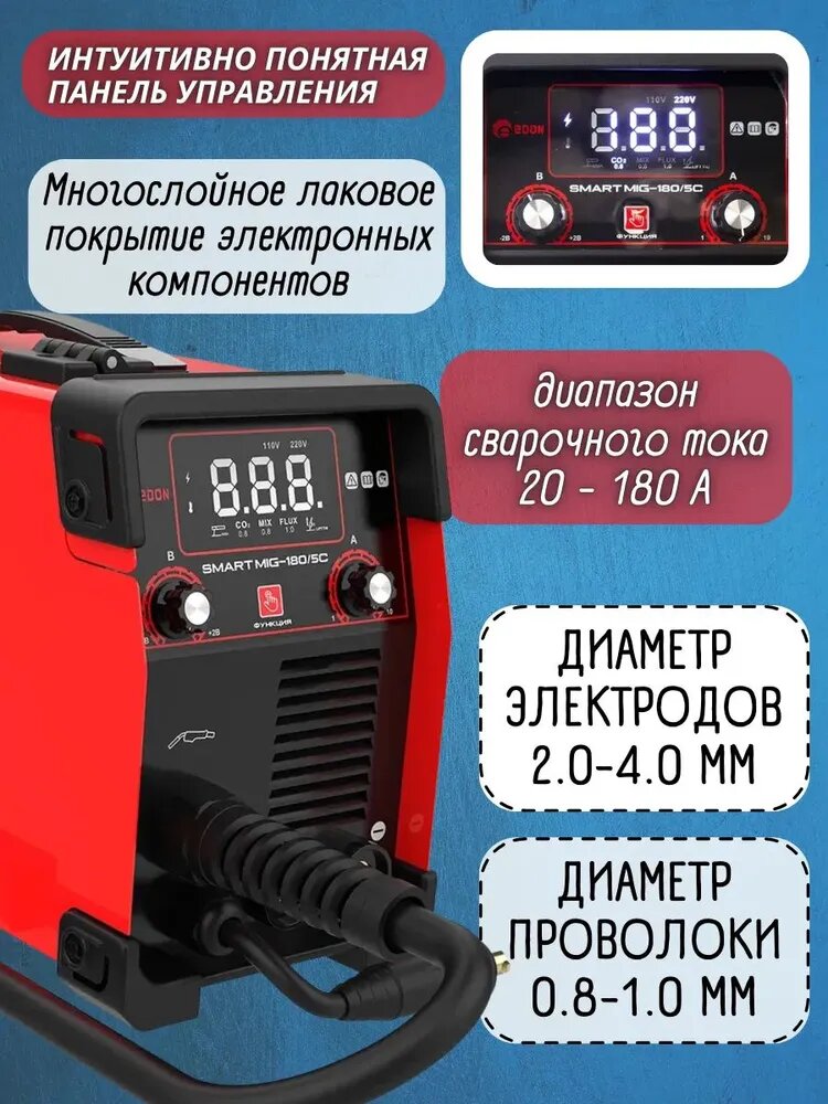 Купить Сварочный инвертор Edon Smart MIG-180/5C, многофункциональный, 6.6 кВ·А, 180А с доставкой по всей России.