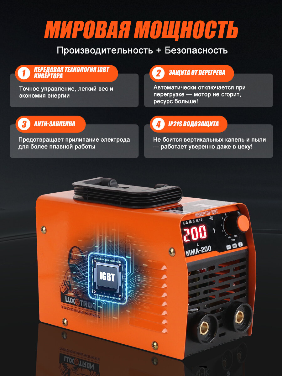 Купить Сварочный аппарат инверторный Luxotron, MMA200 MINI, IGBT, Гарантия 1 год, комплект кабелей с доставкой по всей России.