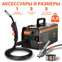① HZXVOGEN сварочная проволока 0.8 мм, 0.9 кг на катушке, 1 шт. ② Зажим заземления 300A, 1.5 м, 16 кв. мм, 1 шт. ③ Сварочная горелка 14AK, 2.4 м, 16 кв. мм, сопло 0.8 мм (в комплекте: 1 сопло 0.8 мм + 2 сопла 1.0 мм) ④ Инструкция, 1 шт. ⑤ Стальная щетка, 1 шт.