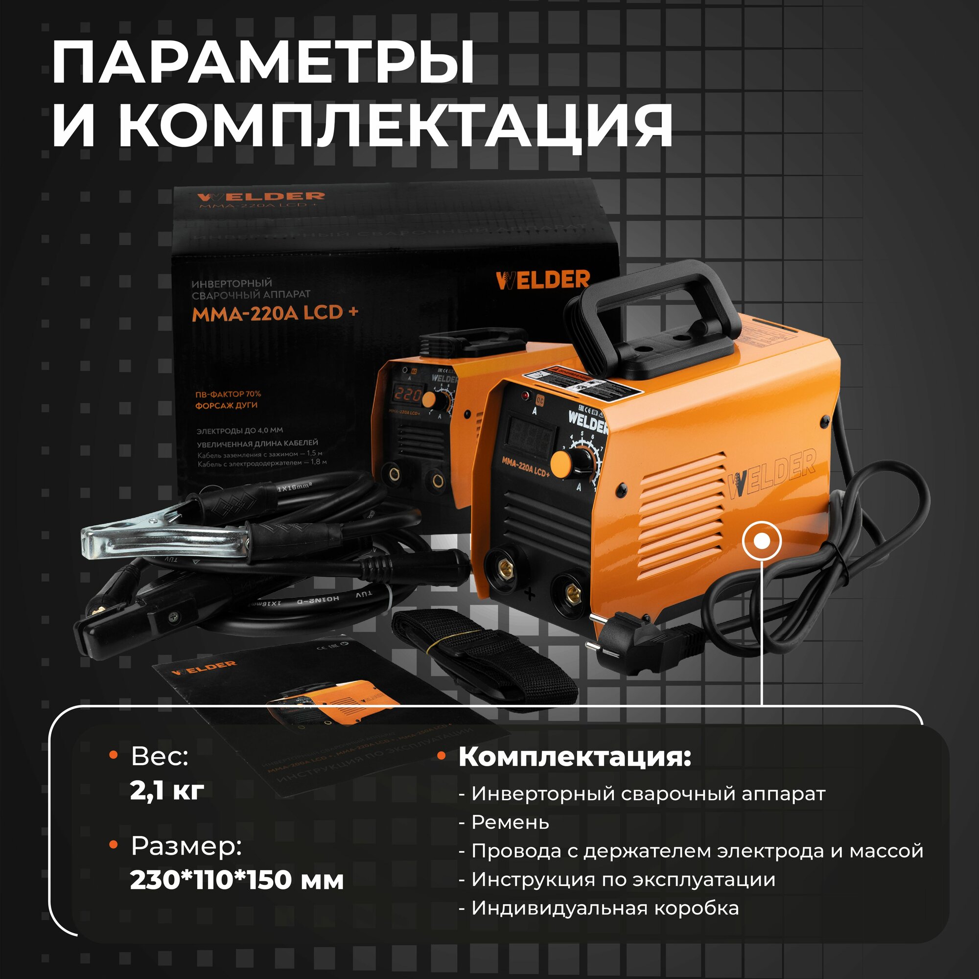 Купить Сварочный аппарат инверторный Welder MMA-220A LCD+, ручная дуговая сварка с доставкой по всей России. Сварочный аппарат инверторный Welder MMA-220A LCD+, ручная дуговая сварка: сравнение цен, характеристики, фото, актуальное наличие и цены.