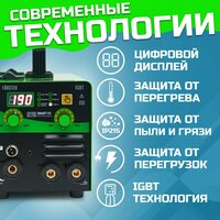 Предназначен для полуавтоматической безгазовой сварки самозащитной (порошковой) проволокой 0.8-1.0 мм, и дуговой сварки штучным электродом от 1.6 до 4.0 мм. С помощью функции LIFT TIG возможна сварка в режиме TIG вольфрамовым электродом.