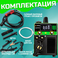 сварочный аппарат 1шт - сварочная горелка в сборе, длина 3,0 м. 1шт - электродный держатель с силовым кабелем, сечение 12 мм2, длина 2 м. 1шт - кабель-масса с зажимом, сечение 12 мм2, длина 1,3 м. 1шт - газовый шланг; 1шт - комплект ЗИП - инструкция-паспорт на русском языке - упаковка