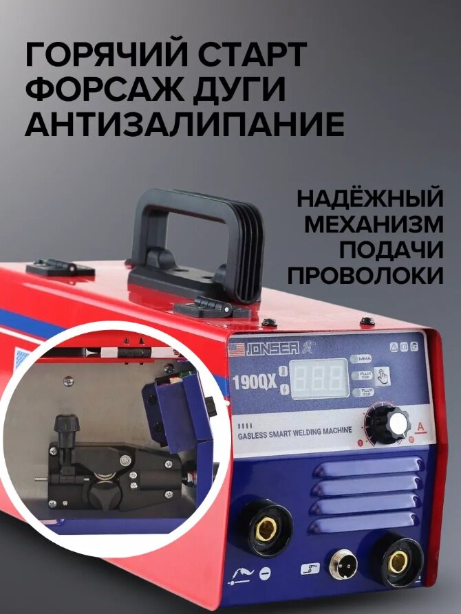 Купить Сварочный аппарат полуавтомат инверторный Jonser 190QX без газа, MMA MIG горячий старт, форсаж дуги, антизалипание с доставкой по всей России.