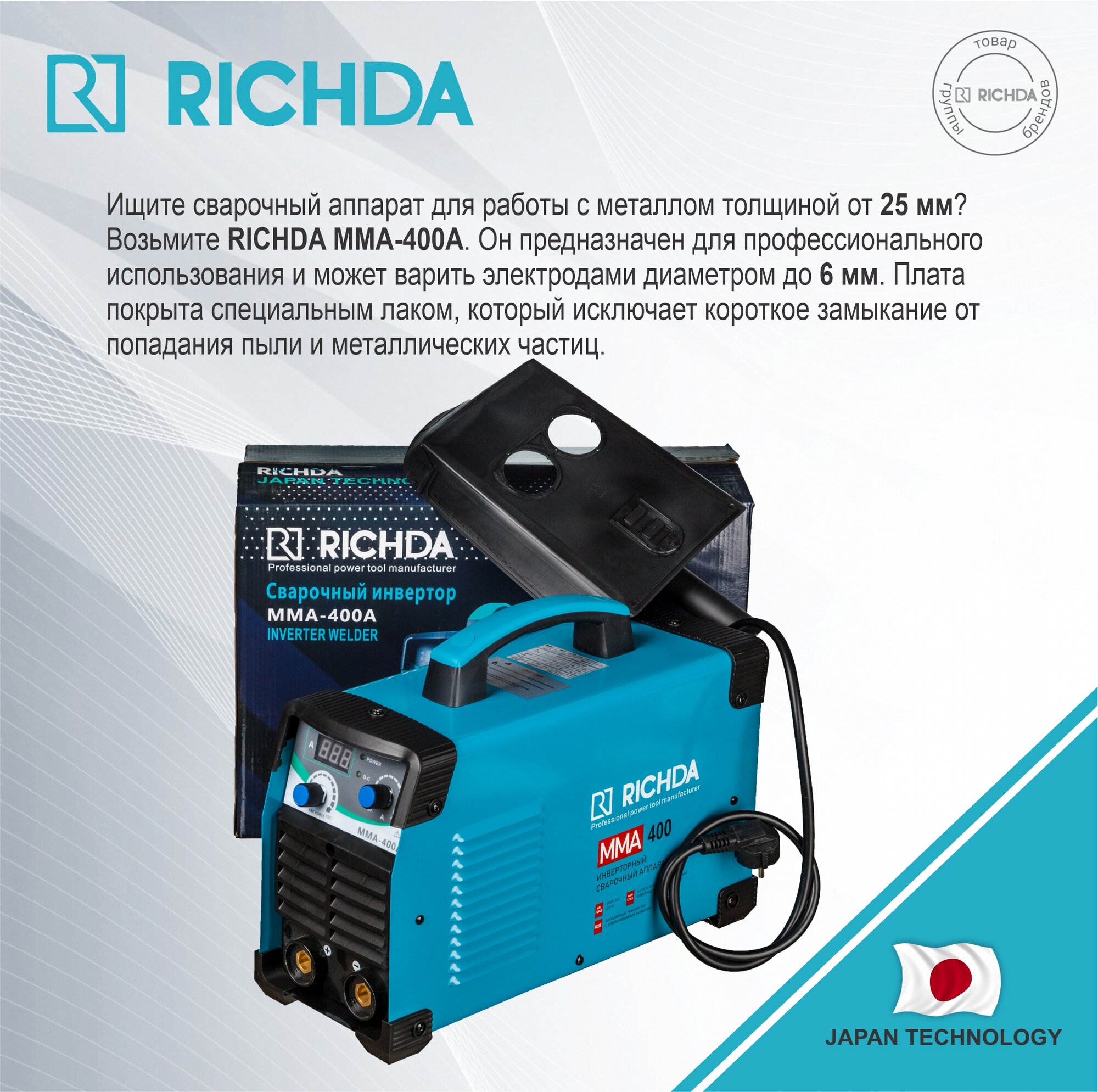 Купить Сварочный инверторный аппарат RICHDA MMA-400A с доставкой по всей России. Сварочный инверторный аппарат RICHDA MMA-400A: сравнение цен, характеристики, фото, актуальное наличие и цены.