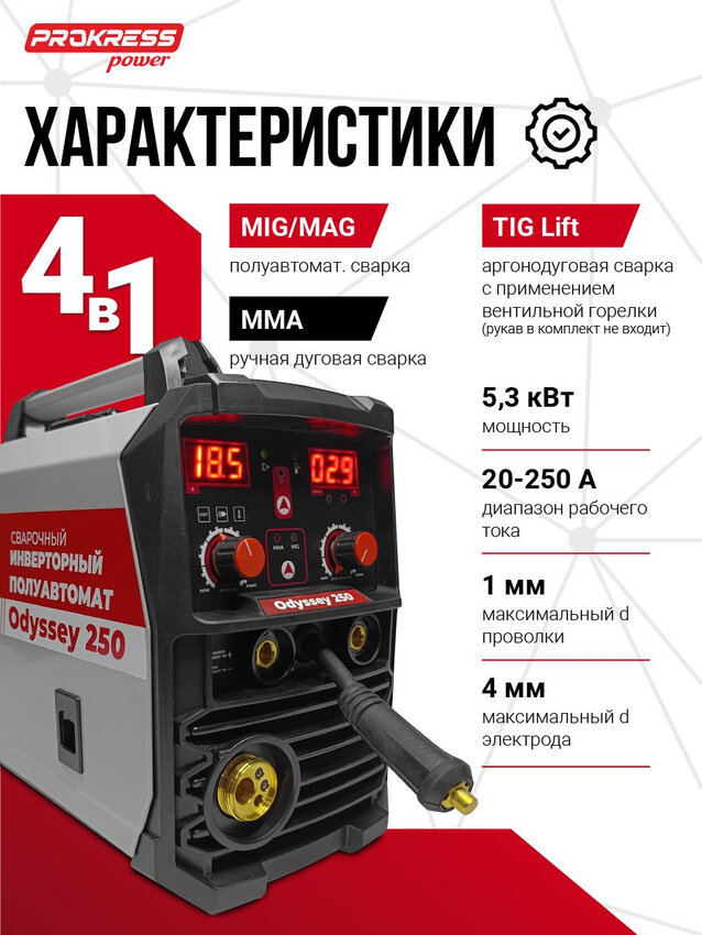 Купить Сварочный инверторный полуавтомат, аппарат для сварки PROKRESS ODYSSEY 250 с доставкой по всей России.