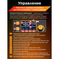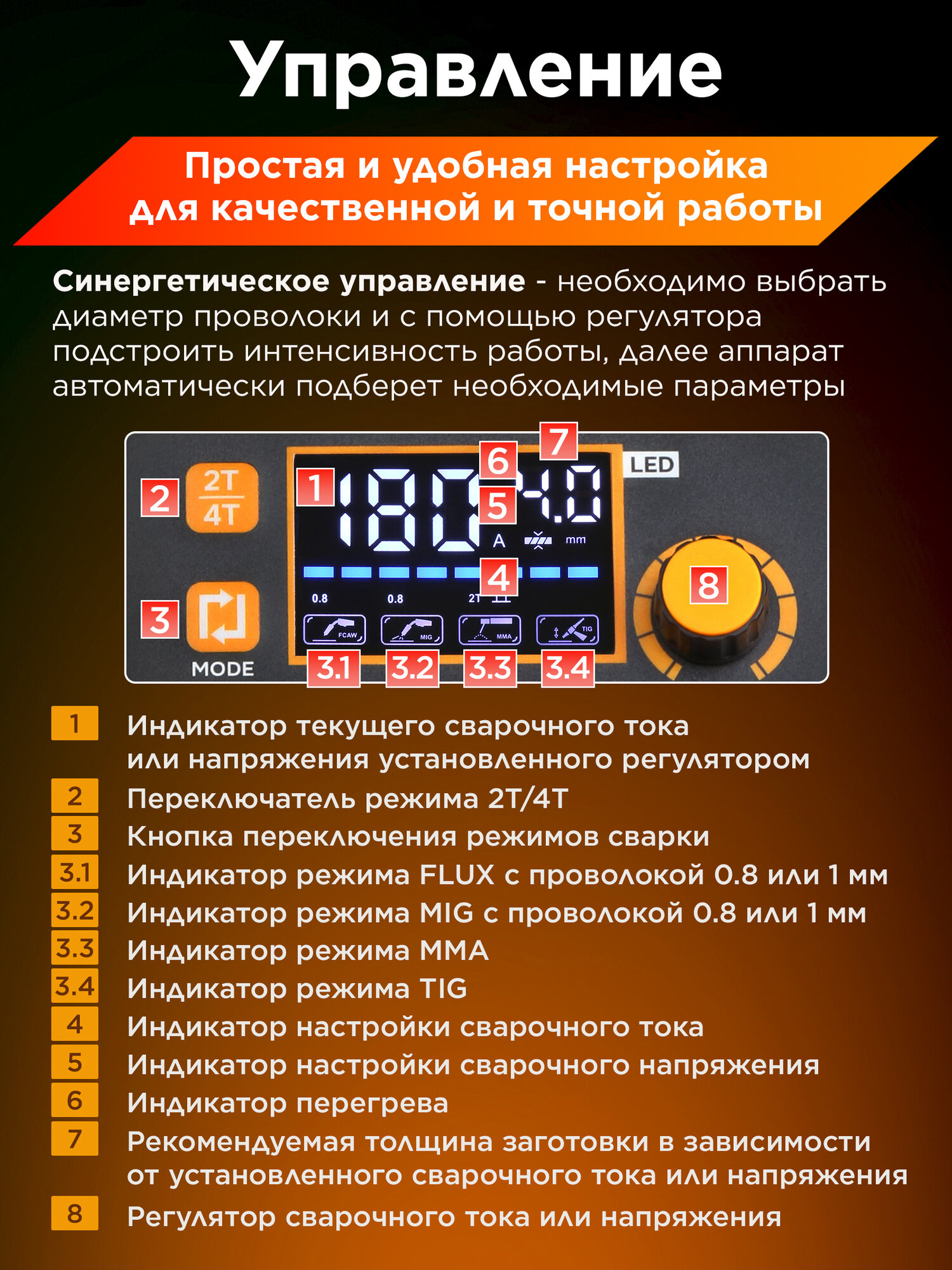 Инверторная технология с применением IGBT-транзисторов обеспечивает высокую эффективность и надежность аппарата.