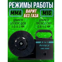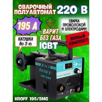 Сварочный полуавтомат KROFF 195/5MG KROFF 195/5MG - профессиональный инверторный сварочный аппарат со съемной горелкой. Предназначен для профессиональной полуавтоматической сварки порошковой проволокой (FCAW), ручной дуговой сварки покрытым электродом (ММА) Выбирая KROFF 195/5MG - Вы выбираете профессиональный надежный полуавтоматический сварочный аппарат, с двух летней гарантией, который разработан и протестирован в Германии с применением самых современных технологий и компонентов. Аппарат очень компактный, легкий. Особенности: - загрузка проволоки от 1 до 5кг - цифровой дисплей; - работа с проволокой от 0,8 до 1,0 мм; - MMA/MIG NoGas (безгазовая); - быстрый старт; - форсаж дуги; - антизалипание; - термозащита; - сварка электродом и проволокой с флюсом. Основные параметры: Входное напряжение - 220 В; Частота - 50-60 Гц; Сварочный ток (MIG/MAG), min - 30 А; Сварочный ток (MIG/MAG), max - 195 А; Сварочный ток (MMA), min - 20 А; Сварочный ток (MMA), max - 195 А Максимальная потребляемая мощность MIG/MMA - 6.2/7.2 кВт; КПД - 85%; Диаметр электродов - 2.0 - 4.0 мм; Диаметр проволоки - 0.8 - 1.0 мм; Длина сетевого кабеля - 1,5 м. Технические характеристики: Напряжение/частота, В/ц 220 10%/~50/60 Номинально потребляемый ток, А MIG: 26.3, MMA: 30.8 Диапазон сварочного тока, А MIG: 50-195, MMA: 20-195 Макс. сварочный ток, А 195 Макс. потребляемая мощность, кВт MIG: 7.5; MMA: 8.7 КПД, % 85 Степень защиты 1P21S Класс изоляции F Особенности: Антизалипание; Горячий старт; Защита от перегрева; Защита от скачков напряжения; Форсирование дуги #Сварочный аппарат полуавтомат, сварочный полуавтомат; сварка полуавтомат; сварочный аппарат инверторный; инверторный сварочный аппарат, сварочный аппарат; полуавтоматическая сварка, сварка, сварка электродом, антизалипание.