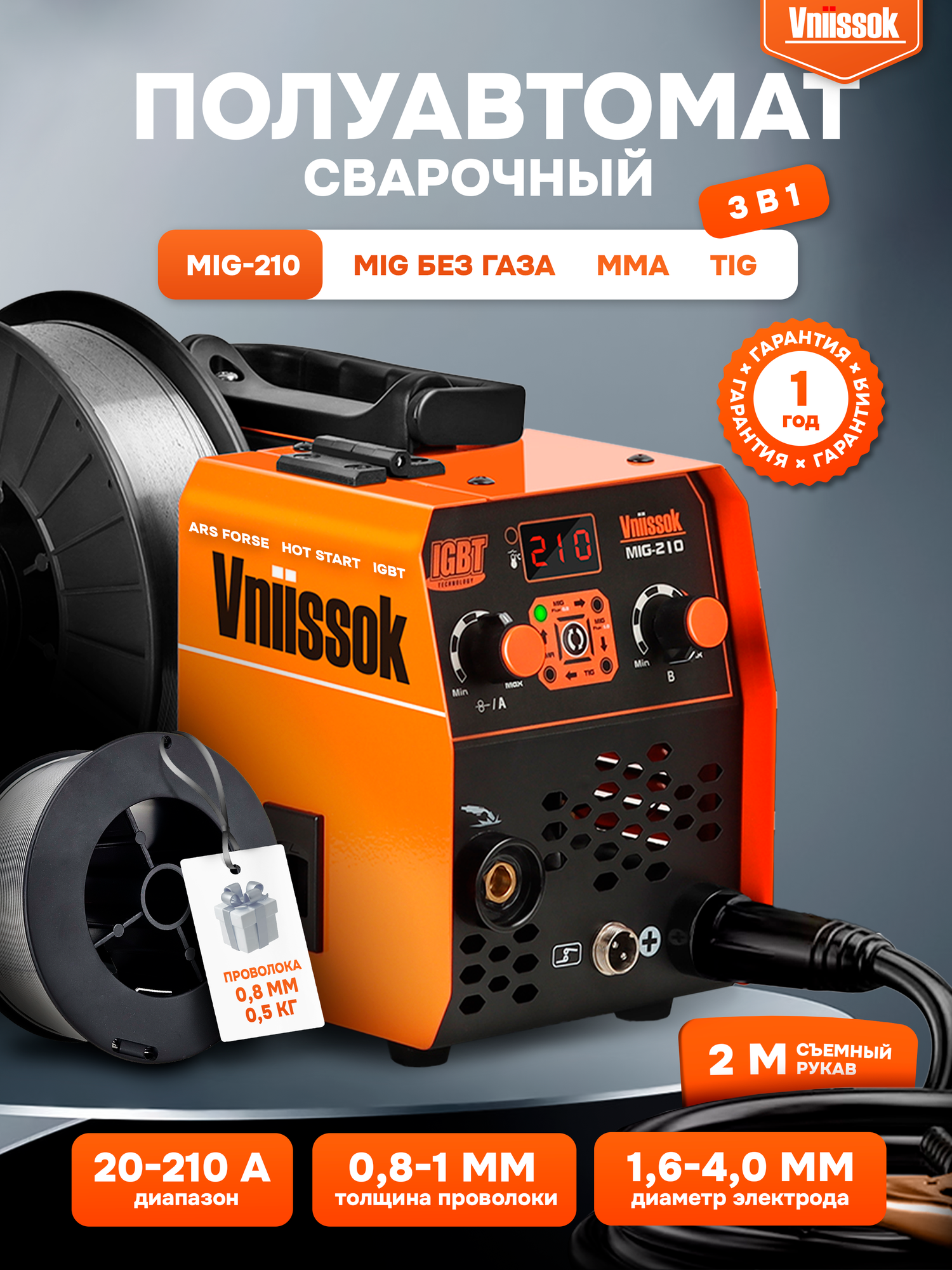 Сварочный полуавтомат Vniissok MIG-210 без газа 3в1, съёмный рукав, катушка до 5кг: сравнение цен, характеристики, фото, актуальное наличие и цены.
