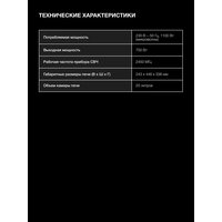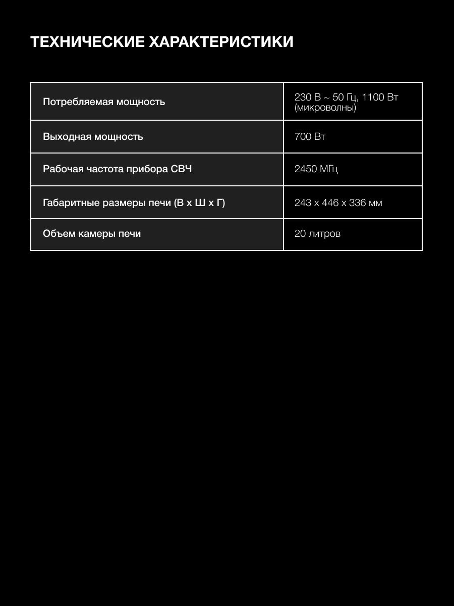 Общая информацияДата выхода на рынок2020 г. ОсновныеИсполнениесвободностоящееТипмикроволны (соло)ЦветбелыйОбъем20 лРетродизайнНет МощностьПотребляемая мощность1 100 ВтКоличество уровней мощности6Выходная мощность микроволн700 Вт КонструкцияСпециальная отделкаНетКонструкция дверцыраспашнаяСпособ открытиякнопкаВнутреннее покрытие стенокэмальПоворотный столДаВозможность остановки поворотного столаНет Производительность и энергоэффективностьИнверторная технологияНет Управление и индикацияУправлениемеханическоеИндикацияНетУдаленное управление (Wi-Fi)НетБлокировка от детейНетЧасыНетОтложенный стартНет Функциональные особенностиОчистка паромНетАвтоматические программы приготовленияНетАвтоматические программы размораживанияНетАвтоматические программы разогреваНетПриготовление на паруНетПоэтапное приготовлениеНетПоддержание теплаНетСохранение пользовательских программНетУдаление запаховНет КомплектацияРешетка для гриляНетПароваркаНетПосудаНетРецепты в комплектеНетВертелНет ГабаритыДиаметр поворотного стола245 мм
