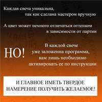 Программа свечи написана с использованием магических символов и заговора, который активирует свечу во время каждого ритуала. Она помогает сосредоточить силу ваших намерений и усилить эффект очищения.